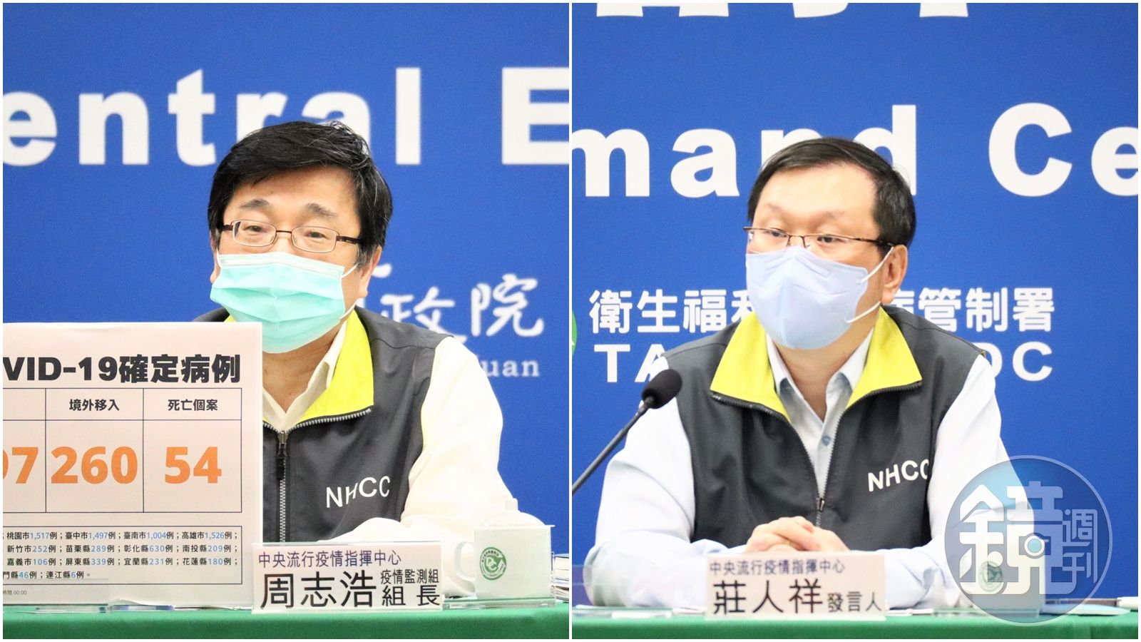 莊人祥則為陽明醫學院公費生,隨後取得陽明大學取得公共衛生學碩士,後赴美國哥倫比亞大學攻讀博士學位,2003年返國後遇上SARS疫情,2005年醫療大數據專長被延攬進入行政院衛生署疾病管制局任職至今,專長為統計與公衛相關技術分析,疫情爆發後,長期擔任發言人職務,對外說明疫情狀況、幾乎全年無休。