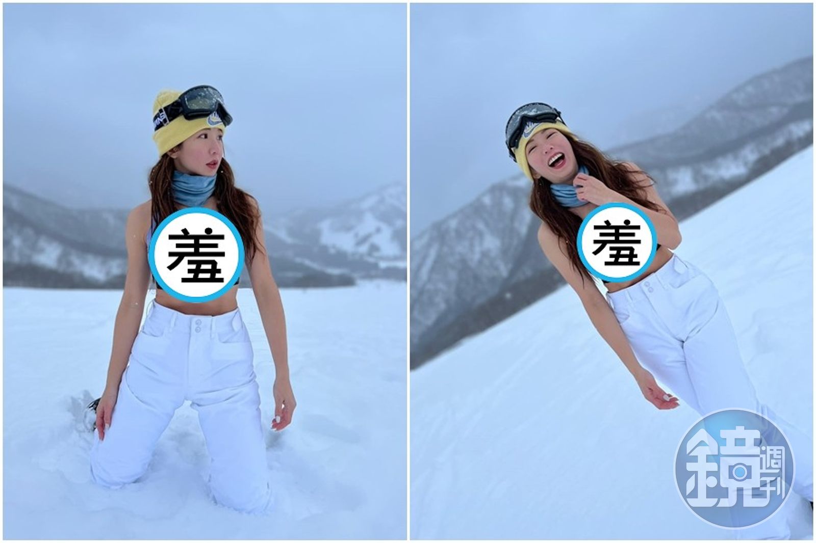 郭書瑤曬出一系列在雪地裡只穿內衣的辣照,還透露照片是由「這群人」茵聲所拍的,只見照片中的她上半身僅穿運動內衣,中間還挖洞露出性感南半球,美胸上下全都露讓網友大噴鼻血,直呼「愛水不怕流鼻水」「辣死了」「這照片好猛!」「妳太性感了」。