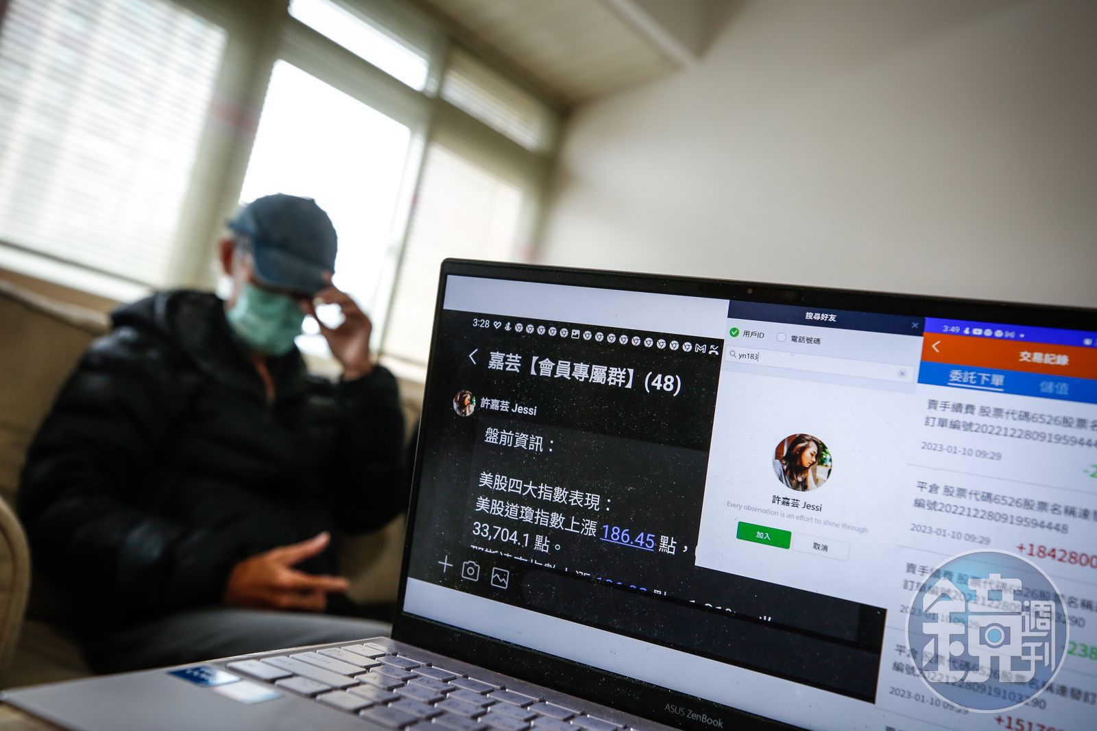 11月某天,在許女慫恿下,阿里加入有許女及一名「黃文儒」老師的投資群組,裡頭有近50人,黃老師除了在群組定期分析個股資訊,群友也會不斷分享跟隨老師炒股、從中獲取暴利的訊息,氣氛相當熱絡。阿里回憶說:「群組每晚8點都會上課,內容多是股市分析的專業內容,學員也積極提問,甚至秀出獲利單,謝謝老師帶領。」
