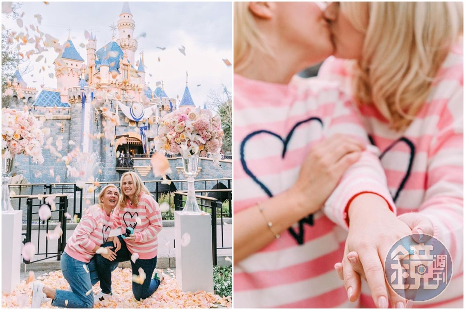瑞貝爾跟女友雷夢拉穿著相同色系的橫條紋上衣、搭配牛仔褲,在迪士尼樂園的睡美人城堡前,空中與地上都灑滿花瓣,象徵她們完成了訂婚。