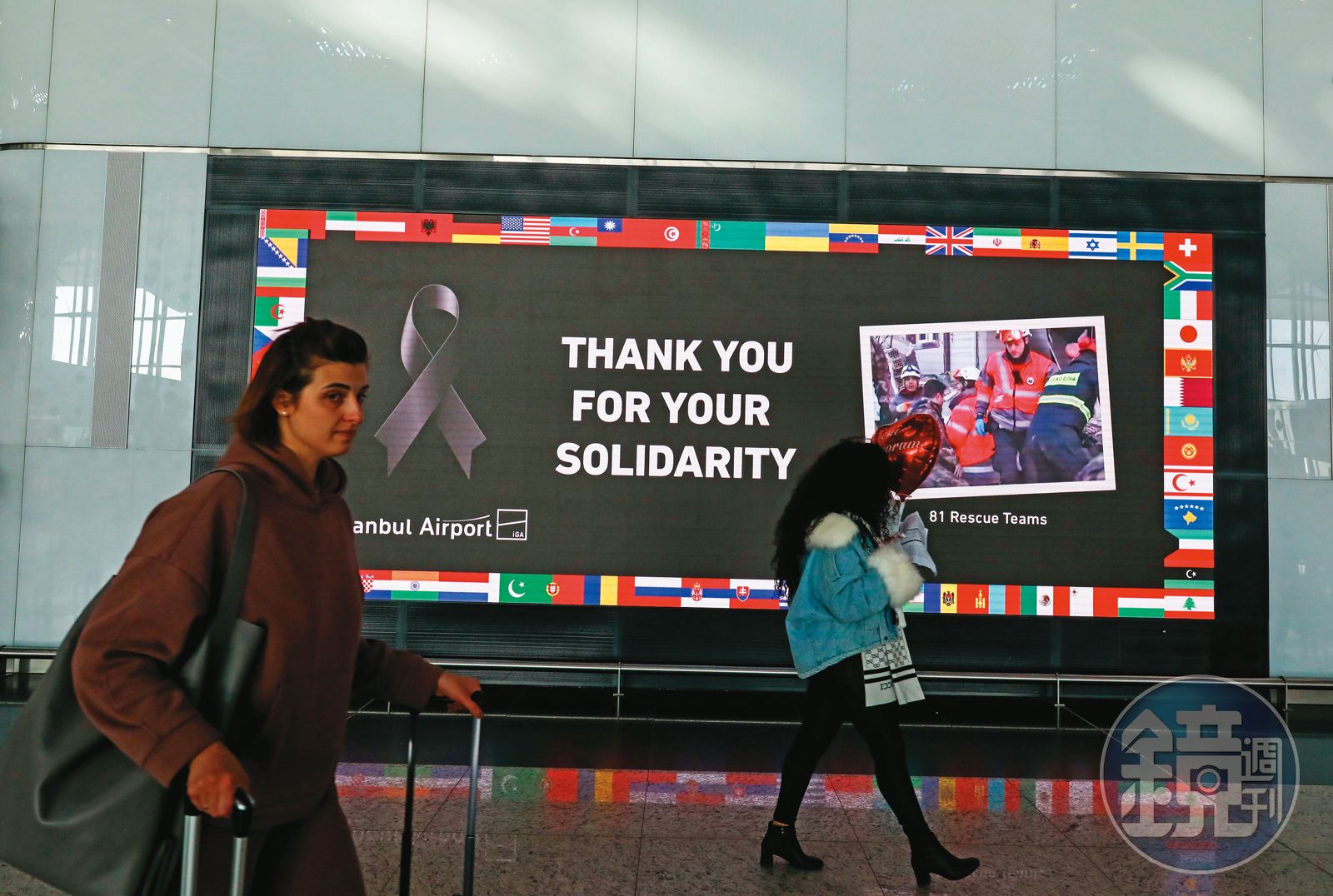 土耳其政府透過機場的電子看板感謝81國搜救隊,我國國旗也在其中。發布時間:2023.02.21 05:58 臺北時間