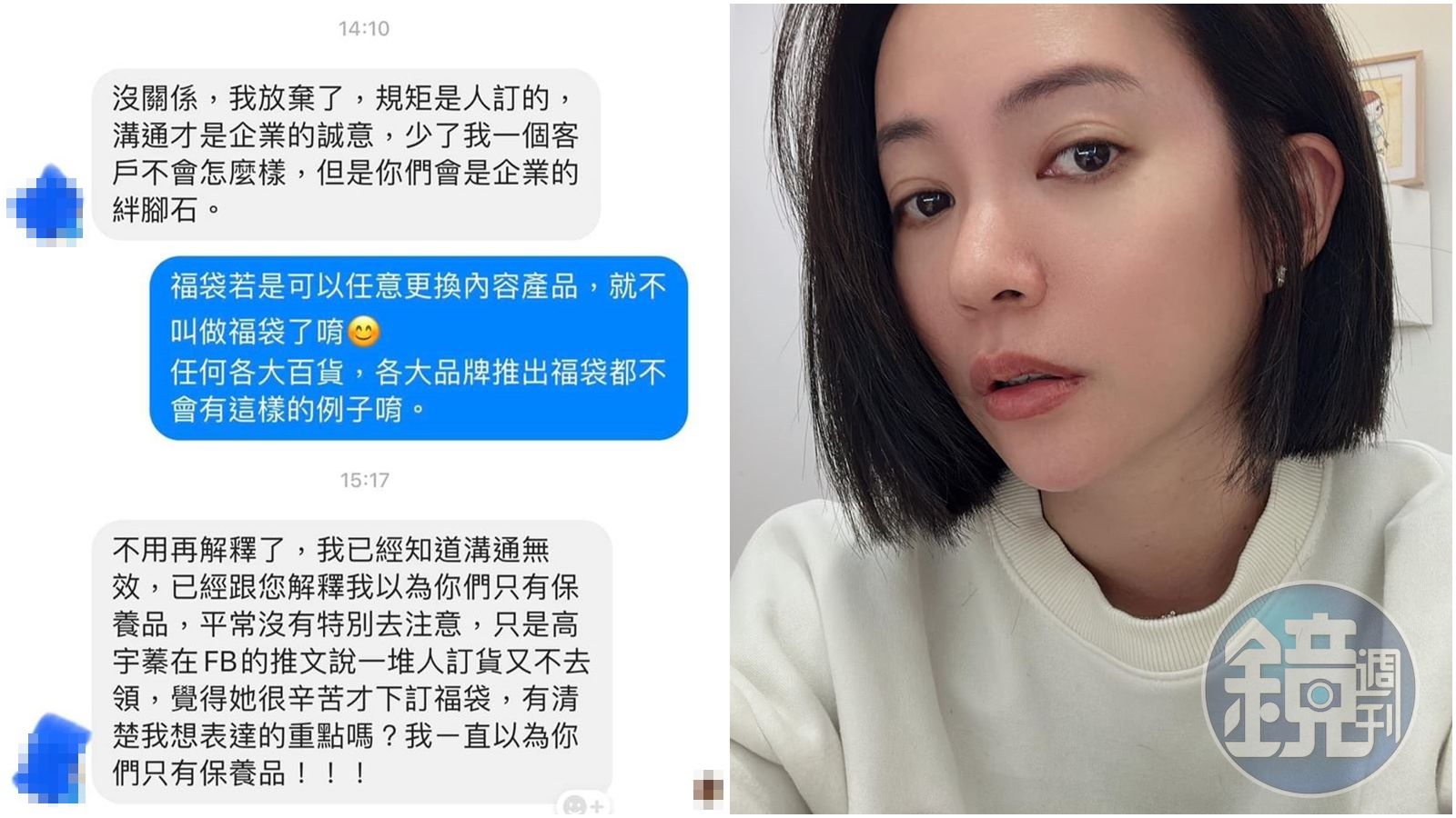 高宇蓁在臉書公布小編和這位消費者的對話,消費者表示,因為挺高宇蓁才購買福袋,卻發現商品用不到,希望能夠更換品項,但小編則回覆,「福袋若是可以任意更換內容產品,就不叫做福袋了唷!任何各大百貨、各大品牌推出福袋都不會有這樣的例子唷。」而該位消費者則惱羞成怒,「沒關係,我放棄了規舉是人訂的,溝通才是企業的誠意,少了我一個客戶不會怎麼樣,但是你們會是企業的絆腳石。」