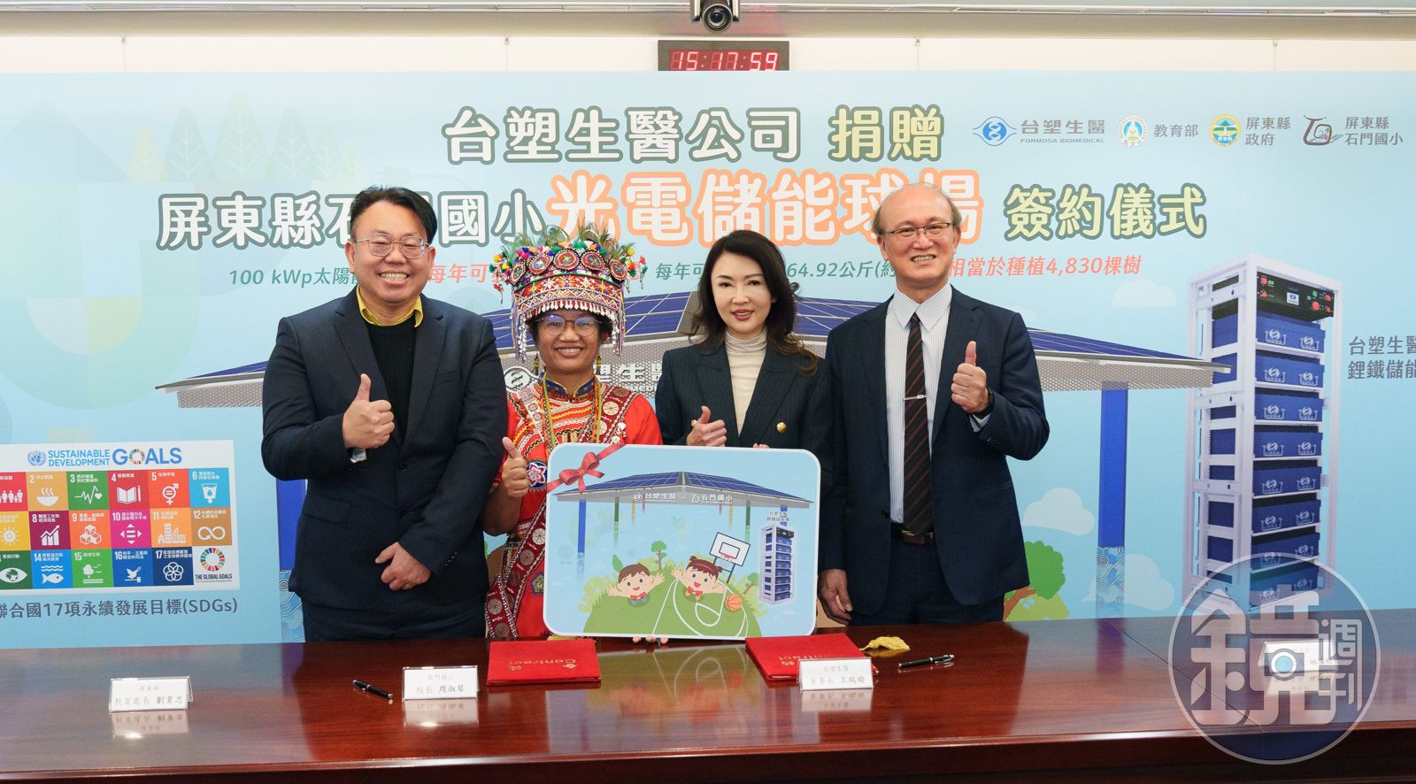 石門國小校長周淑琴表示,屏東縣牡丹鄉石門村位處山中,石門國小為部落少有的空曠場域,是部落族人集會、運動及緊急避難的場所。這次很感謝台塑生醫不僅願意負責石門國小光電儲能球場興建案,更是完全無償捐贈,球場鋼構興建及太陽能儲能系統。