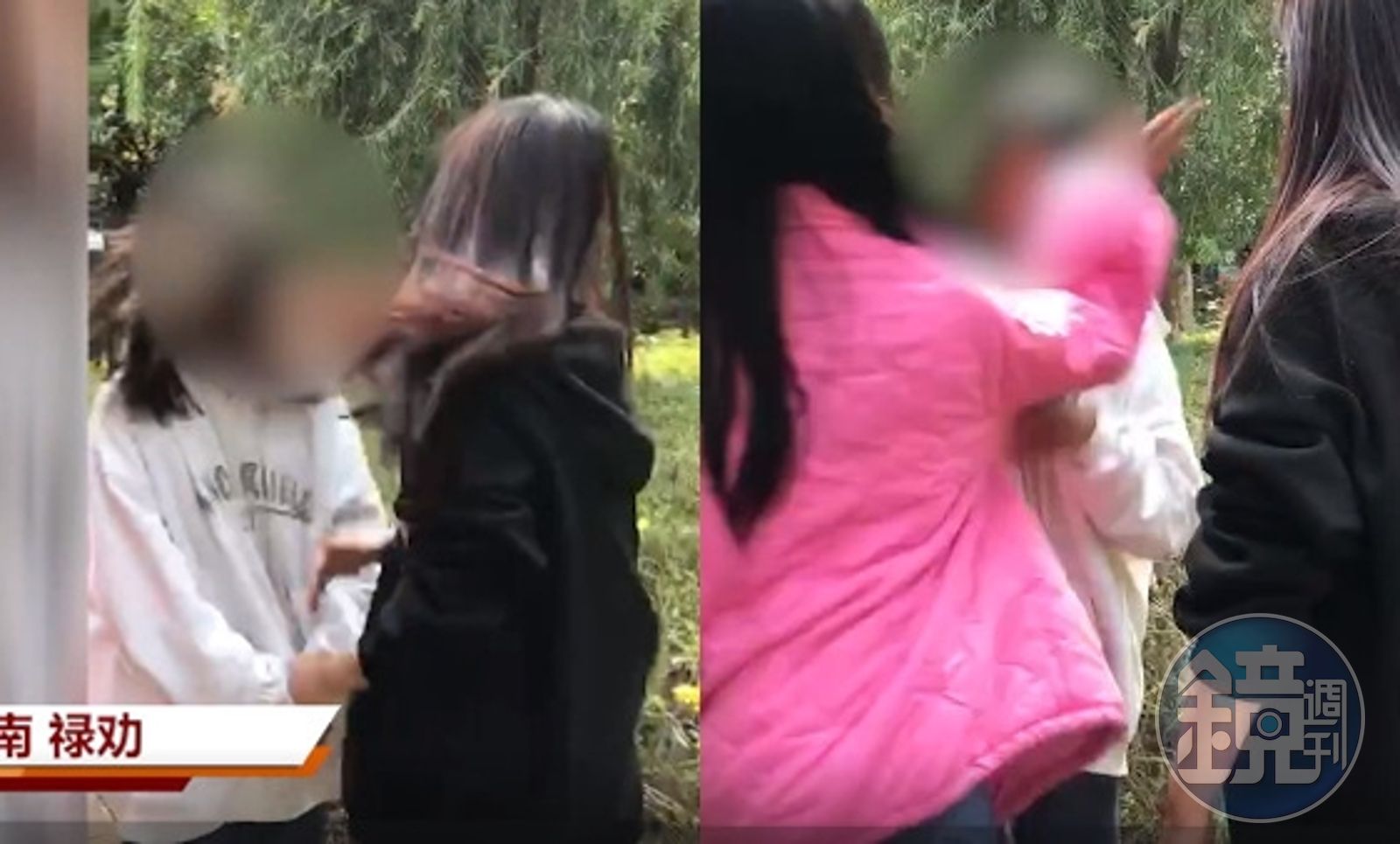 影片中甚至可見被害女生蹲在地上瑟縮哭泣,也被打到流鼻血,血還滴落沾在袖口,看起來十分怵目驚心。