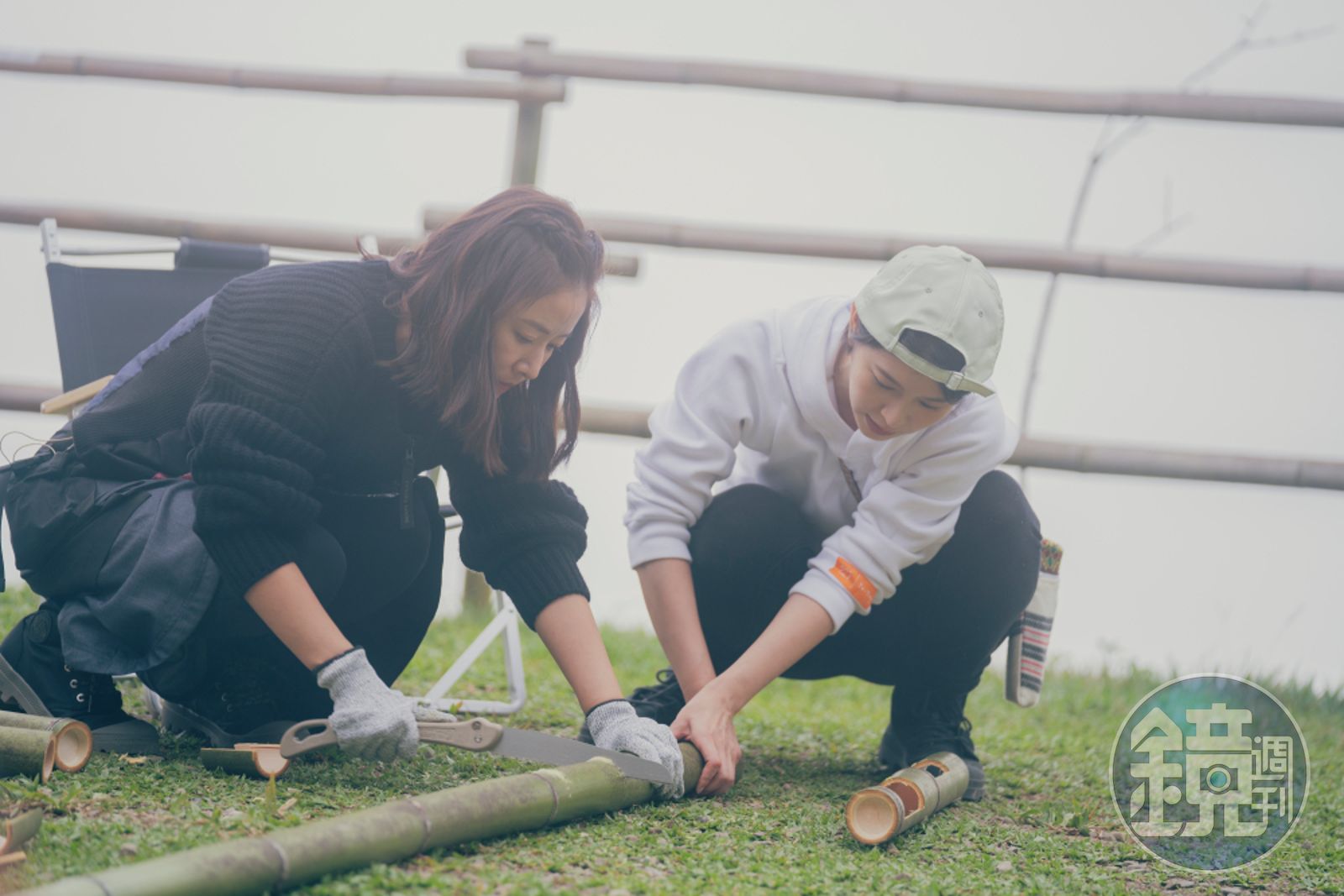林心如(左)與江宜蓉合力鉅竹子。(TVBS提供)發布時間:2023.02.23 21:44 臺北時間