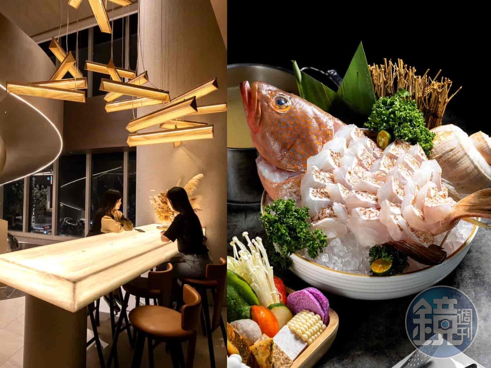 「沐明鍋物」的大廳走低奢雅緻路線,鏡面天花板設計也讓空間加倍延伸。27樓大廳裡的吧台旁的旋轉樓梯是許多饕客喜愛的拍照點。沐明精緻的sky bar不是一小區,而是自成一店的霸氣。28樓的包廂內是中式圓桌,公關說用餐時會呈現各種高級食材排開的另類「合菜」。Zona提到,創辦人自小在金山漁村長大,對於新鮮漁貨的挑選、烹煮有著絕對自信。因此沐明鍋物的自信之作為活體海鮮,除了可以選擇帝王蟹、波士頓龍蝦等頂級海味,每日嚴選的現撈漁貨更是極致氣派,「時令鮮魚」的紅斑魚一登場,從魚頭到厚切魚肉無一處不紅嫩透亮,下鍋輕涮後入口,魚片Q彈飽滿近乎脆口。