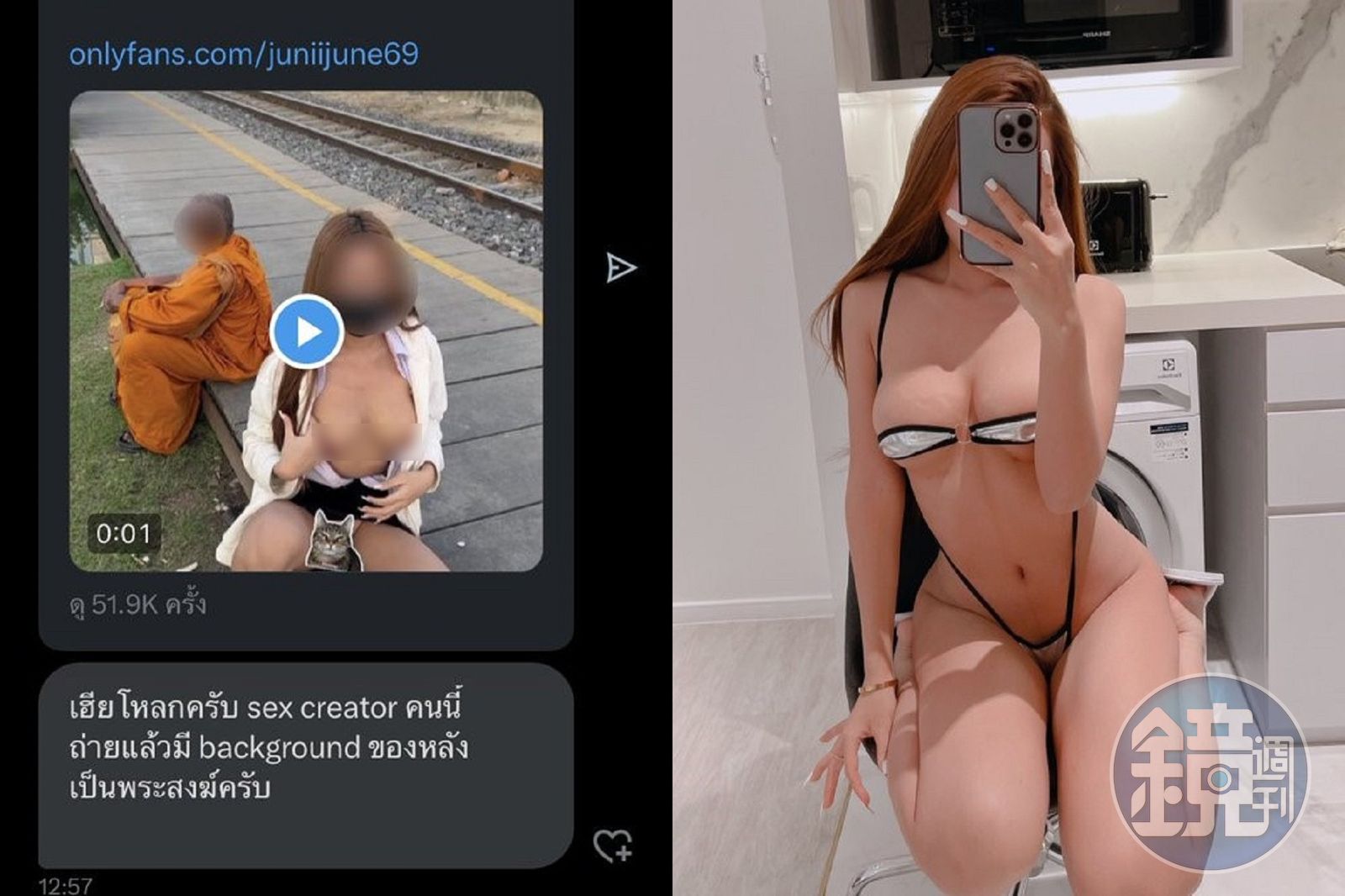 據泰國《Sanook》報導,這位正妹的個人官方推特,不時出現18禁影像,近日她更特別企劃「色即是空、空即是色」,故意跑到一處郊外進行野外露出,身後還有一名和尚。正妹更稱,只要粉絲們願意付699泰銖(約新台幣615元),那麼她所拍攝的「老衲的棒子」影片,就會無私分享。