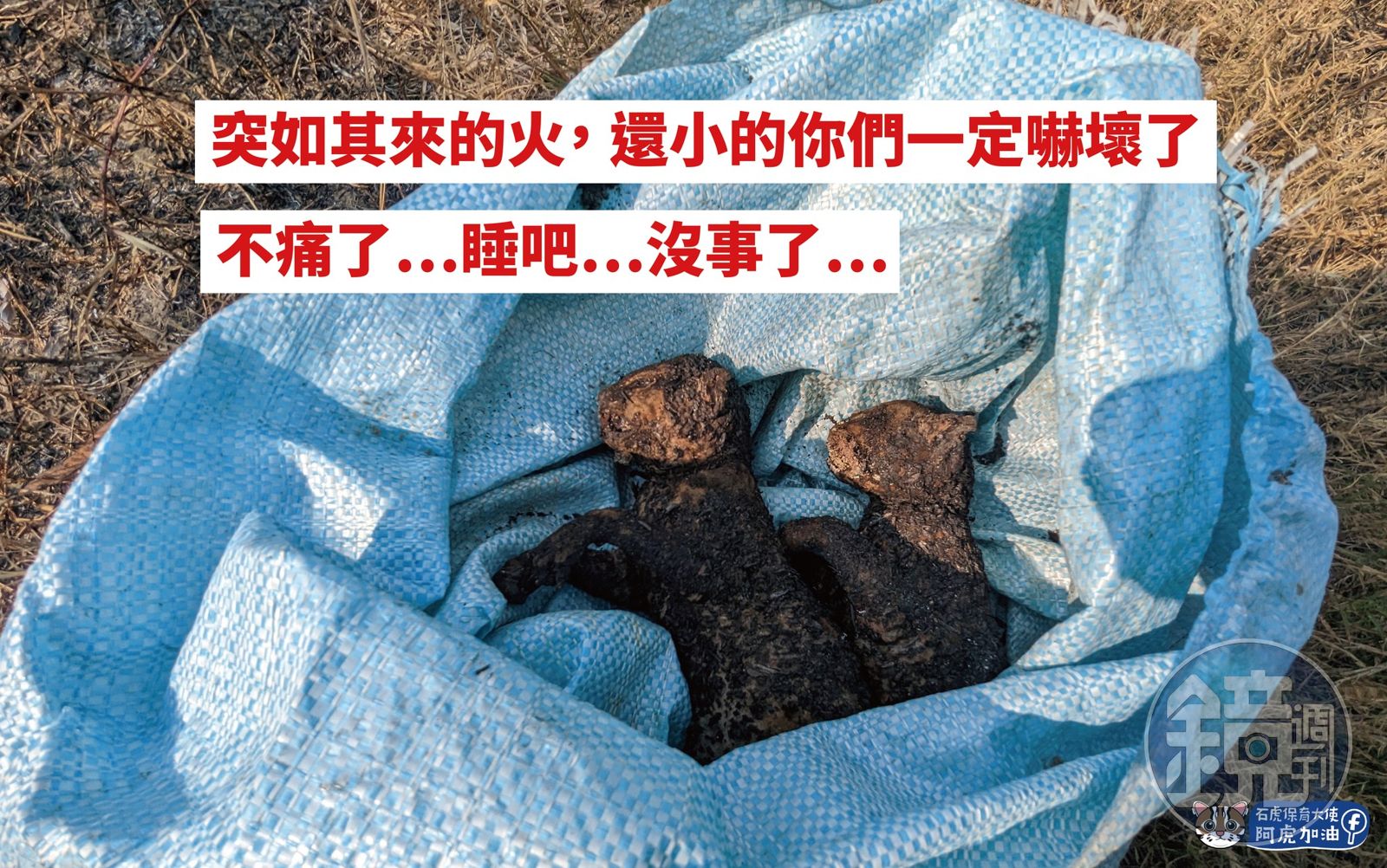 不過追蹤人員在3月1日時,發現豆棗的生產區域遭大火燒過,研究人員在隔日回到火燒區域搜索,找到2隻被燒死石虎寶寶屍體,約莫一個月大,獸醫檢視研判為一公一母。
