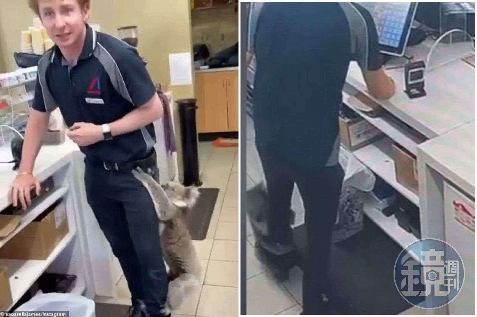 據英國《每日郵報》報導,上週末突然有隻無尾熊光顧這間加油站超商,她看了一下貨架上的零食飲料後,直接走到櫃台,看到收銀台的男店員後,無尾熊竟然直接「硬上」男店員,並把男店員的大腿當成大樹幹,讓男店員一時間嚇得不知所措。