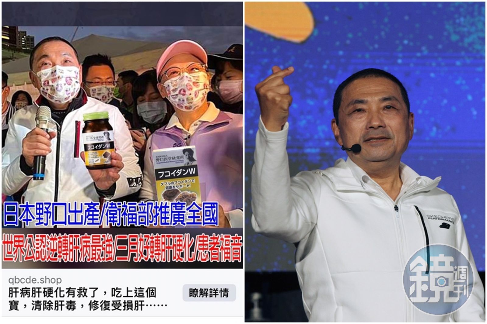 侯友宜的臉書粉專今天PO出一張臉書截圖,照片中可見新北市長侯友宜拿著一罐肝藥,廣告還打著「日本野口出產/衛福部推廣全國」「世界公認逆轉肝病最強」「三月好轉肝硬化」等廣告用語。