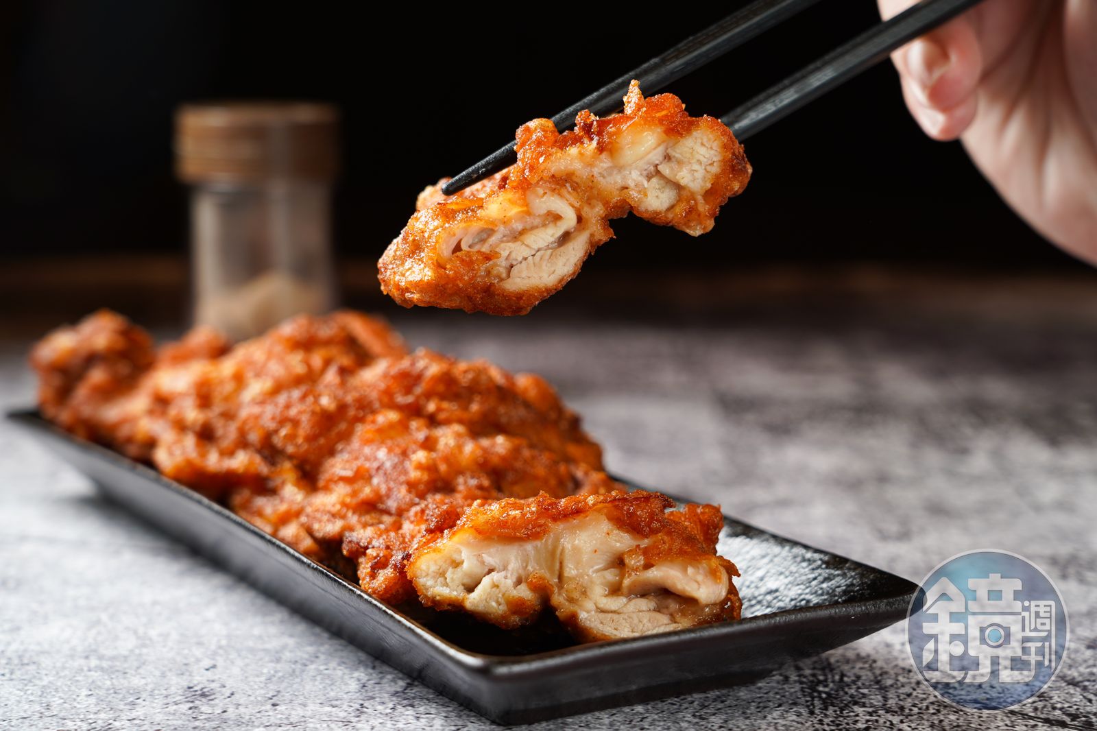 裹上日本麵粉下鍋酥炸後,麵衣相當硬脆,形成一個防護罩,能把雞腿肉的肉汁完全鎖住,所以大口咬下的時候,千萬要小心會噴射出來的雞汁。雞肉軟嫩鮮甜、醃漬入味,完全不需要胡椒鹽、七味粉或是Q比美乃滋。