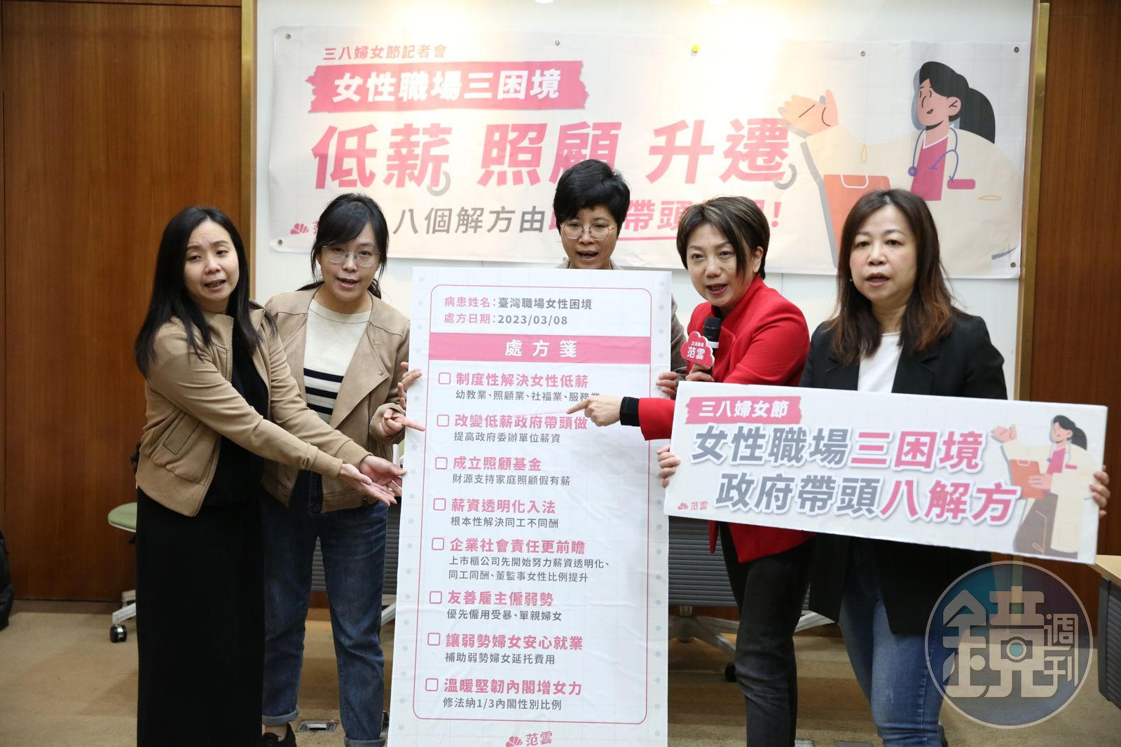 范雲今與台灣職業安全健康連線、婦女救援基金會、婦女新知基金會、台北市產業總工會召開三八婦女節記者會,他們提到,2023年的台灣,還有許多女性在職場和家庭中掙扎,想在職場自我實現的女性卻被迫因為照顧問題而離開工作。