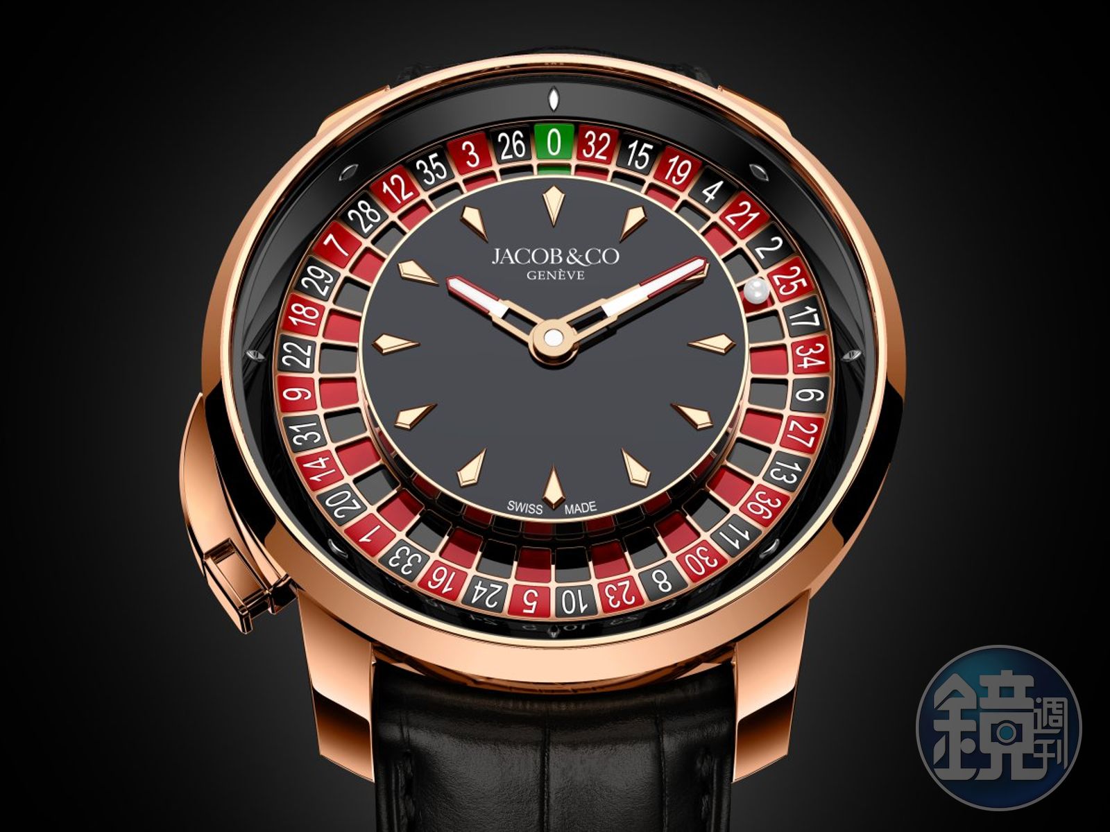 Casino,直譯為「賭場」,這詞在中文似有貶意,然而在西方上流社會與潮流文化之中,Casino比較像是一個時髦奢華的社交場合,是富人的遊戲場所。這也就是為什麼,錶壇許多頂級獨立品牌都曾以博弈為主題,設計出多款厲害腕錶。例如複雜功能大師Christophe Claret,就曾做過互動博弈型複雜腕錶三部曲,利用其擅長的逆跳機芯結構,設計出包括「21點」「百家樂」與「德州撲克」的主題。而獨立製錶品牌FRANCK MULLER的Vegas錶款,也曾以輪盤圖案做為面盤設計。而JACOB & CO此次推出的Casino Tourbillon,則是把一座貨真價實的微型「輪盤」遊戲,利用機械動偶的結構,移植到手錶內了。