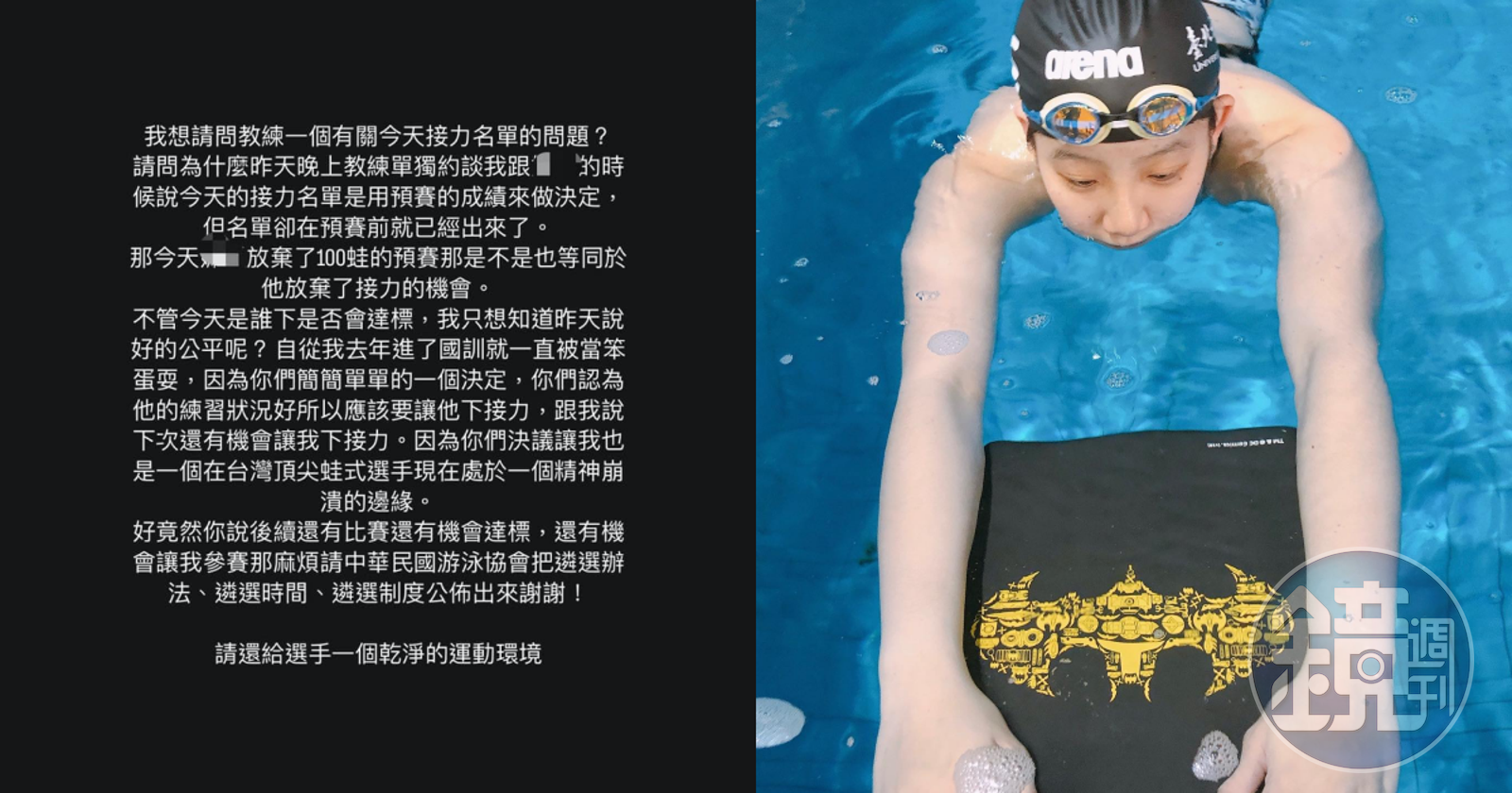 洪潔瑜11日在IG發布限時動態,表示先前教練告知她接力的名單是用預賽的成績做決定,但名單卻在預賽前就已經出來了,「不管今天是誰下是否會達標,我只想知道昨天說好的公平呢?」並直言這就像「預賽前被宣告不治」,讓她不知該如何面對這場預賽,在游的當下也不停問自己「我是不是真的很爛」。