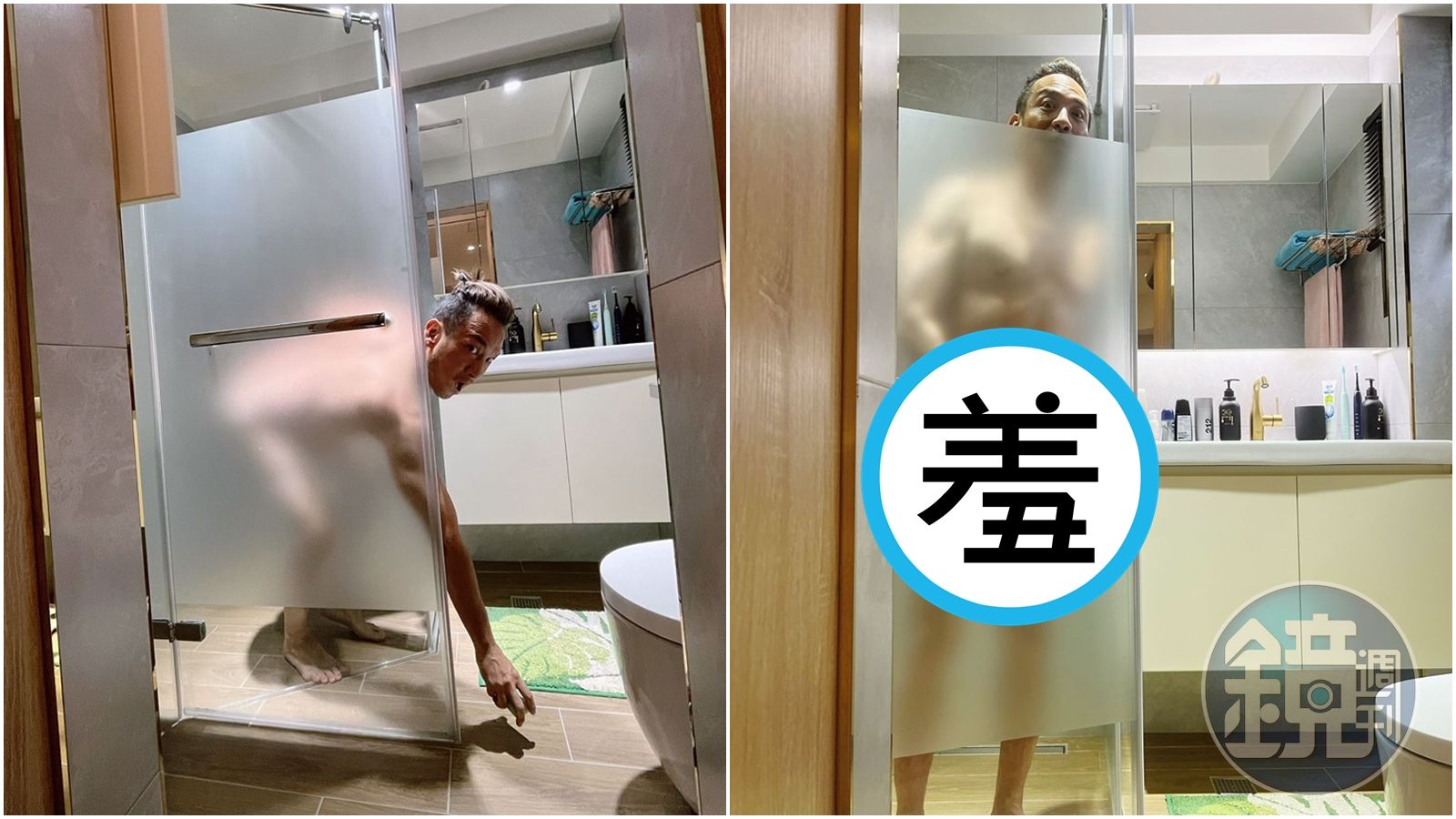 高山峰前陣子在三立《一家團圓》中演出,有一對兒女的他,身材保養的不錯,今天他在臉書分享在浴室全裸,3點不露的畫面,其中一張只用手遮住下體第3點,另一張則是經典的彎腰撿肥皂畫面,透過毛玻璃,隱約可見雪白臀部,也給網友不少想像空間,好友陳德烈還讚他「好身材」,原來他是為衛浴品牌寫業配文,還強調「在浴室一定要裸體呀!」十分敬業。