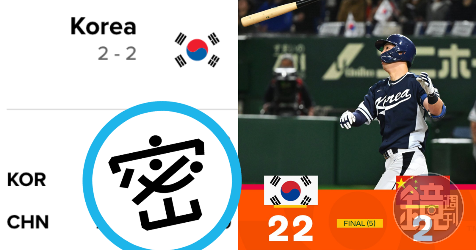 中國在首局拿下2分後就熄火,整場比賽只打出4支安打,反觀韓國則是火力全開,全場狂轟猛炸20支安打,包含2支滿貫砲,僅用5局就以22比2扣倒中國,提早下班。這場比賽也創下經典賽會內賽最大分差紀錄及單場最多得分紀錄。