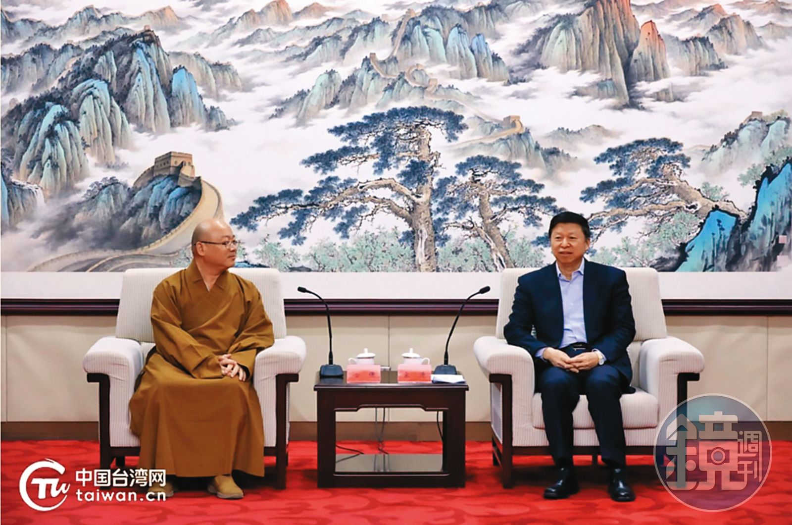 佛光山創辦人星雲法師過世,中方弔唁團未遵循申請程序無法成行,最後由佛光山住持心保和尚(左)赴中會見國台辦主任宋濤(右)。(翻攝中國台灣網)發布時間:2023.03.15 05:58 臺北時間