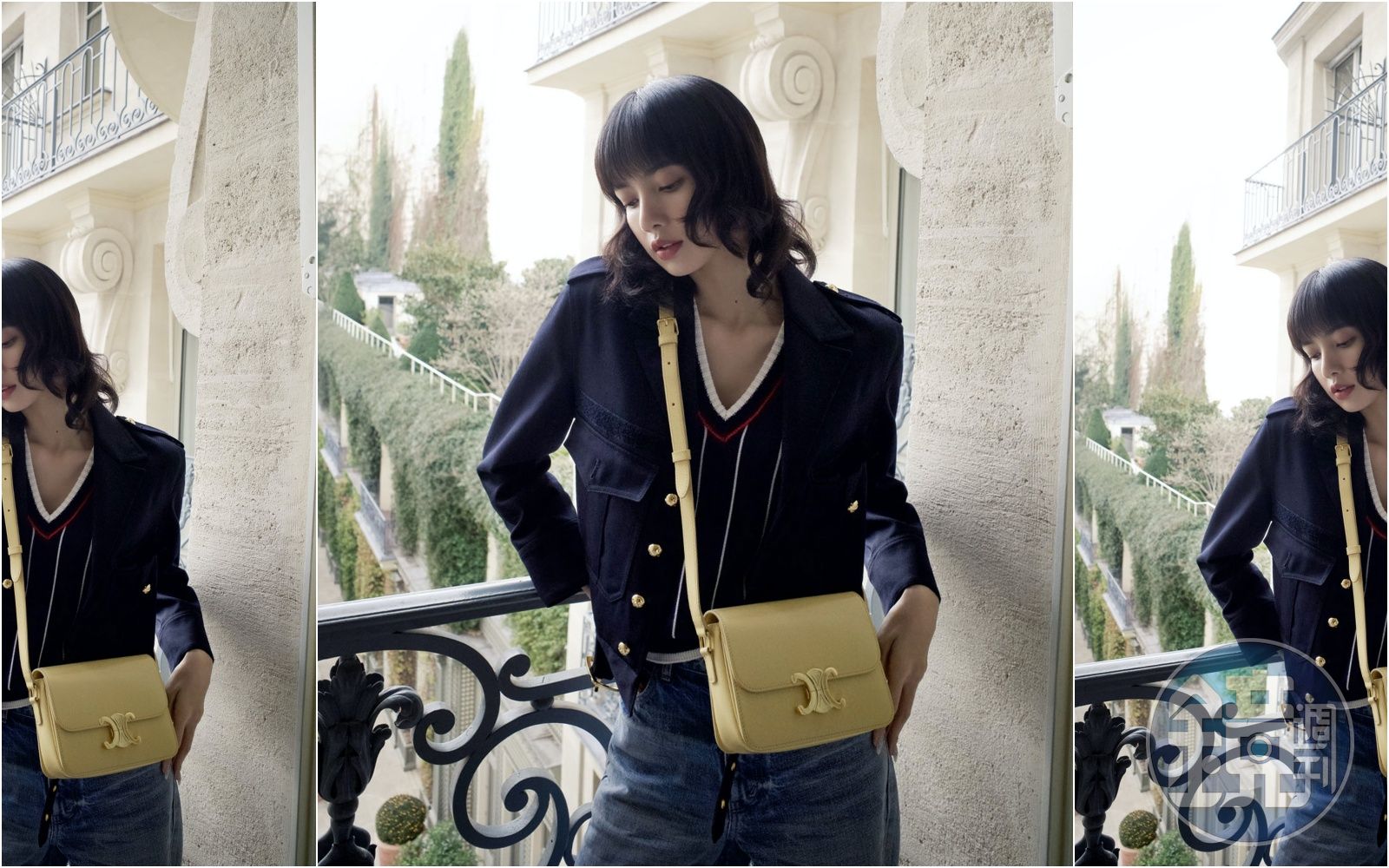 Lisa穿著V領直條紋背心、軍裝風格短版外套搭配丹寧褲,身上斜背著花粉色Triomphe手袋,傳達一種春日閒適風情。(CELINE提供)發布時間:2023.03.16 21:10 臺北時間