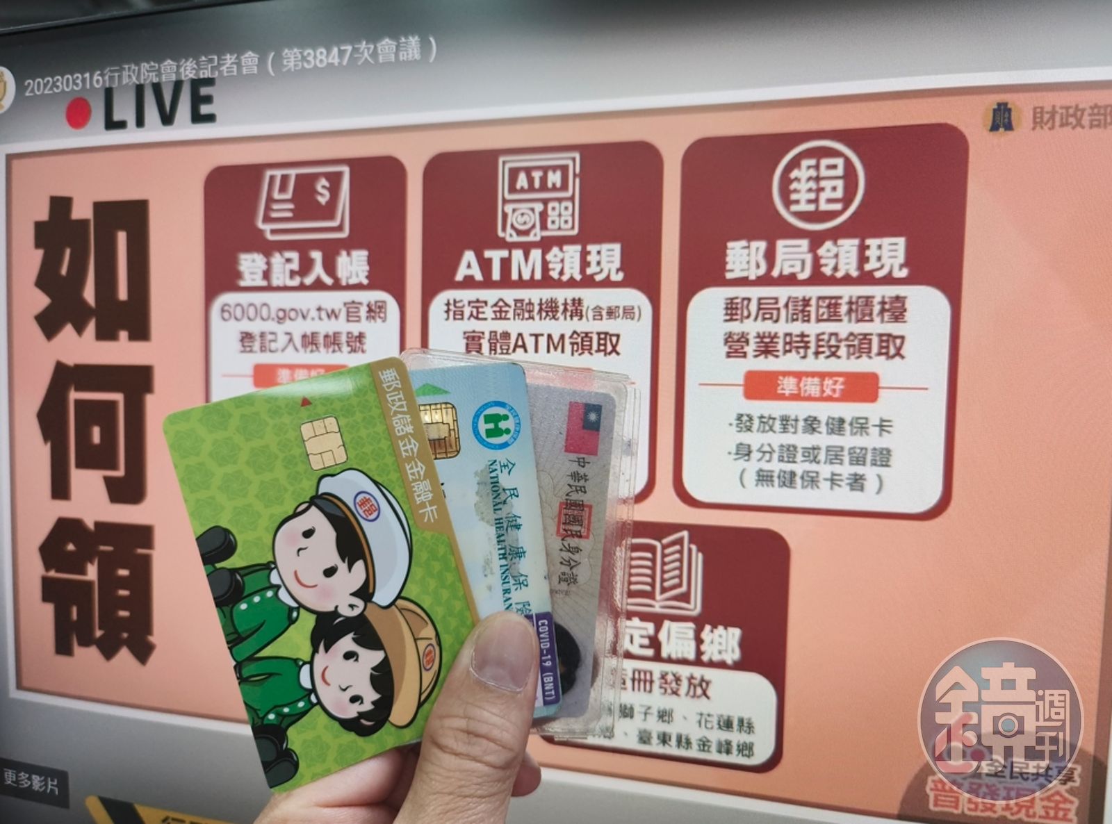 ATM領現則是用身分證字號加上健保卡卡號,到任一實體ATM,並且選擇「全民共享普發現金」的選項,接著輸入提款密碼領取;最後,若是選擇直接到郵局領現,也要準備健保卡,簽收後能直接拿現金6000元。