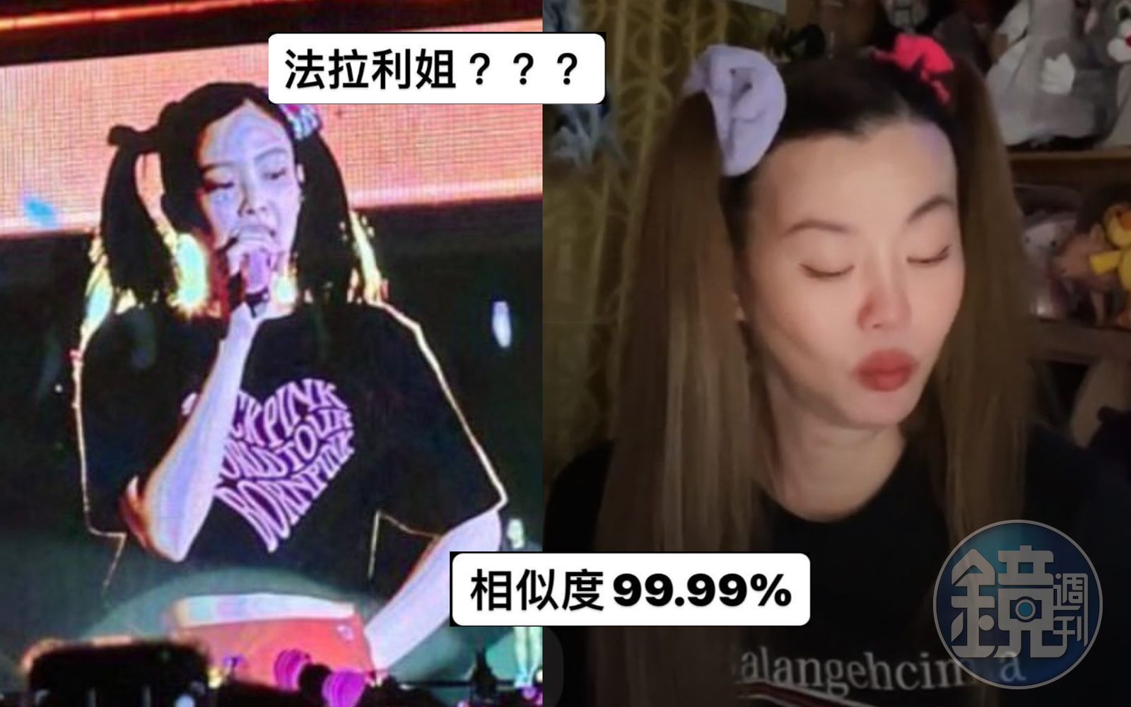 吳姓粉絲不小心把Jennie拍成「法拉利姐」張婷婷,求心裡陰影面積?(翻攝自IG)被譽為「人間香奈兒」的Jennie特別綁了雙馬尾載歌載舞。照理說,綁了雙馬尾的美眉應該看起來超級萌,但不少粉絲看了雙馬尾的的Jennie,不禁眉頭一皺,驚呼:「真的不是婷婷嗎?」「相似度99.99%!」「珍妮完美復刻我們阿義(張婷婷)的完美臉龐。」