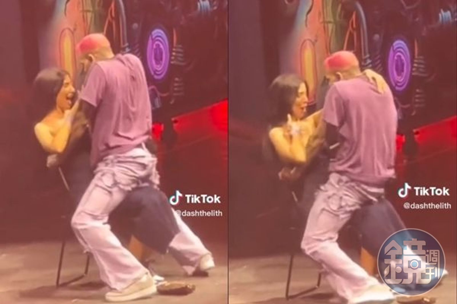 克里斯小子近日如火如荼的展開巡迴演唱會,近日一場演出上,再度挑一名女觀眾上台互動,只見女方坐在椅子上,他則熱唱名曲《Take You Down》,唱著唱著突然跨坐在女粉腿上,下秒便做出模擬性愛的前後擺動的姿勢,被偶像熱情互動的女粉絲,也興奮做出回應,順勢將手放在他的背上一路滑到臀部,全程持續大概4、5秒。