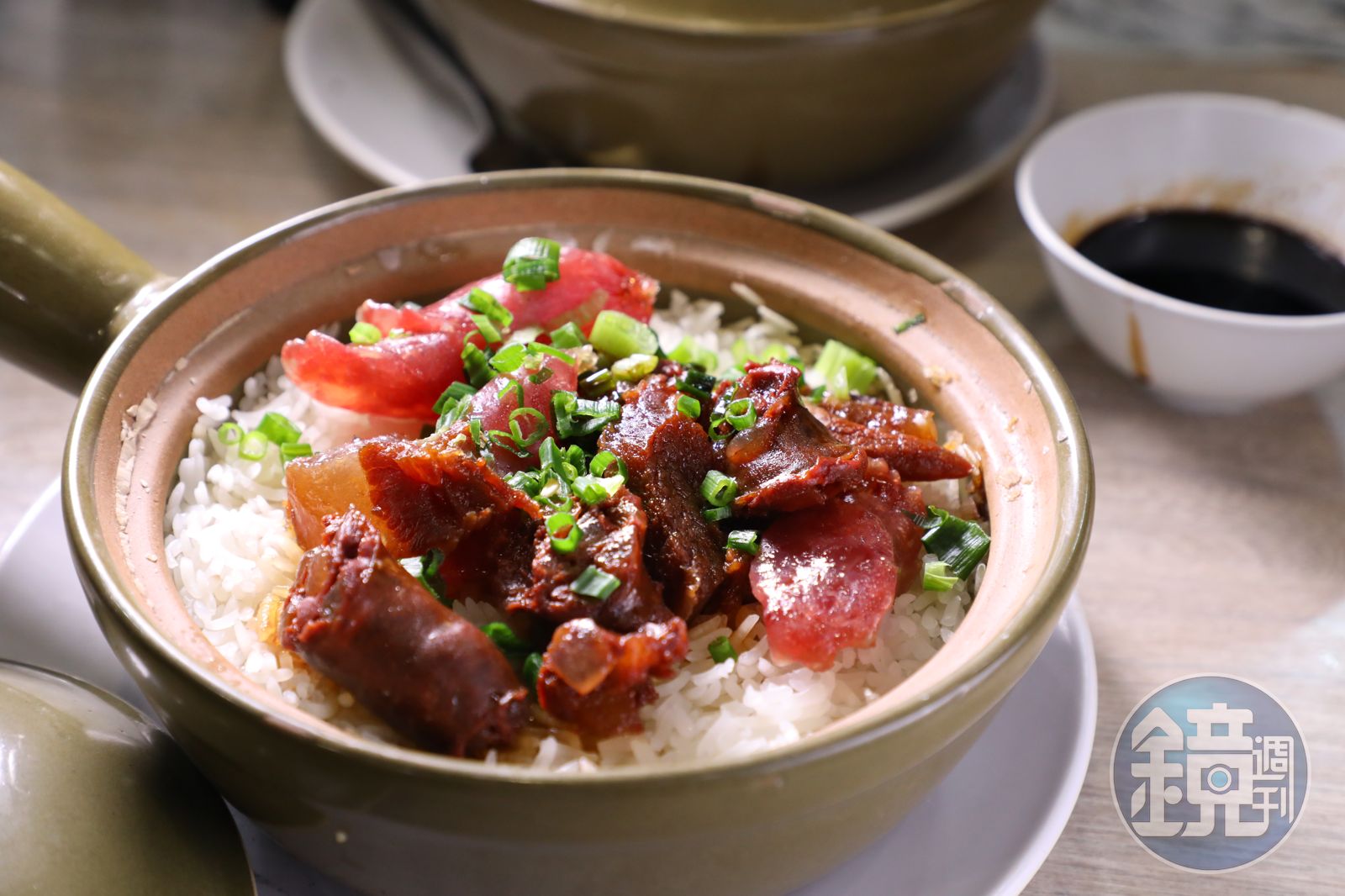 吃過點心,終於等到重頭戲上桌,今天我點了「臘味飯」和「白鱔滑雞飯」,算是香港煲仔飯中的經典口味,煲仔上桌,熱度真不是假的,連蓋子都超級燙,訓練有素的店員送煲仔上桌後,戴著手套過來掀開蓋子,在米飯中央畫圈圈似的淋上加入炒過香料、臘肉皮、日本元貝的特調豉油,然後再蓋上蓋子,等待30秒後,就可以開吃了。據說這樣做是為了不讓豉油堆積在煲底,影響鍋巴的顏色,燜的時間也經過計算,太長會影響米飯乾爽口感,太短又還沒入味,30秒剛剛好。