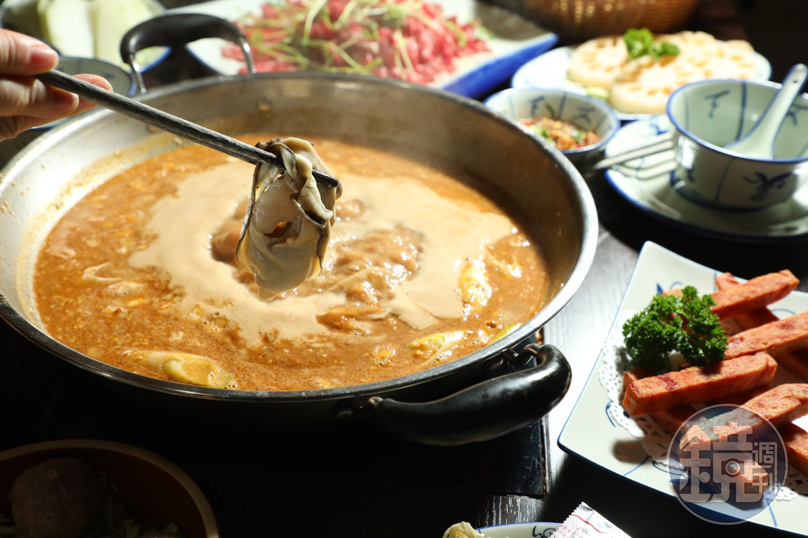 火鍋料很有意思,除了手切本地牛肉、秘製豬頸肉、美國桶蠔、桂花蚌等必吃海陸食材,當然也要點周星馳電影中的「爆漿瀨尿牛丸」、不太健康但超好吃的「煎午餐肉」、現點現炸超美味的「即炸響鈴」、一定要放的「出前一丁」,還有香港首創,有麻辣、孜然、蜜糖等6個口味的「Shake Shake炸魚皮」,要自己把魚皮放入專用紙袋中搖晃調味,在等火鍋湯滾的時候當前菜吃也不錯。