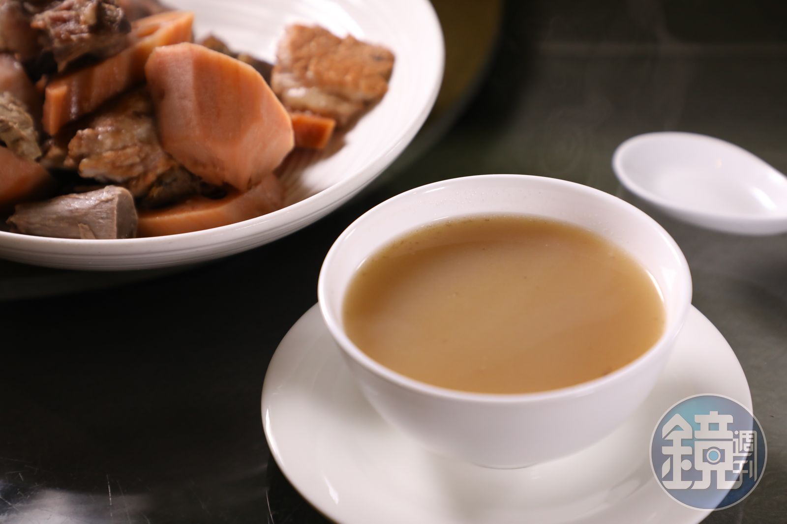 廣東人吃飯必定點湯,益新的「花膠筒四寶燉菜膽湯」「淮杞鳳足燉螺頭湯」,或我私心最愛的「杏汁燉豬肺湯」,都是需要預訂的老火靚湯。這天我們喝到以蓮藕和雞肉煲到呈褐色的「明火煲例湯」,清爽甜香,以台灣人的標準來看,已經足夠好喝,一碗下肚,感覺工作的疲勞一掃而空,難怪香港人會說,如果一頓飯沒有湯,這頓飯就是不完整的。