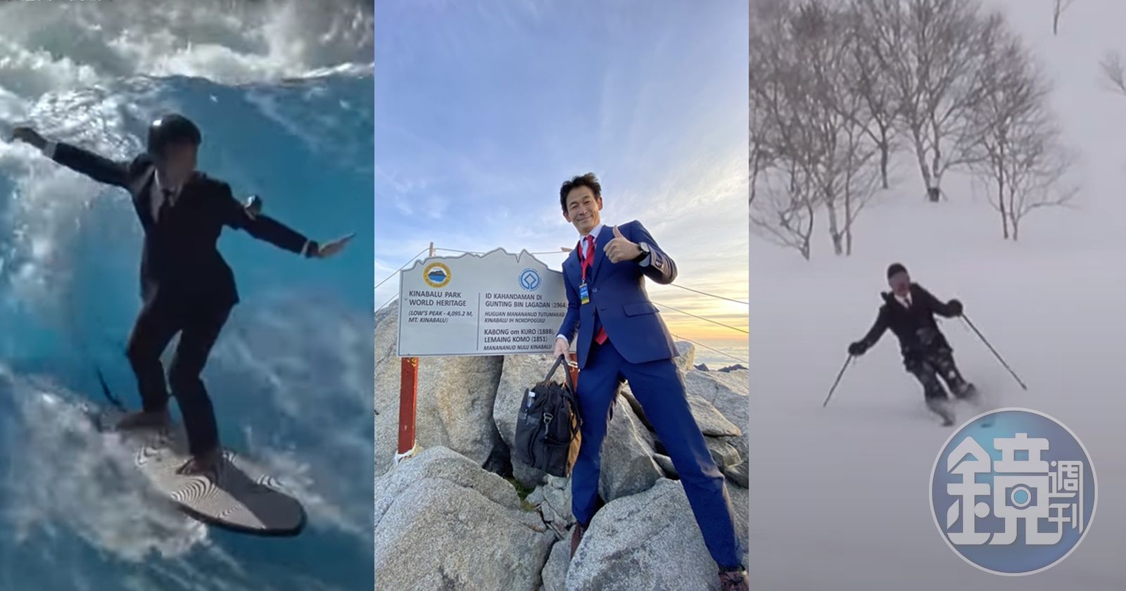 近日有山友在京那巴魯山上看到一名「社畜」,他身穿全套西裝、皮鞋,脖子上掛著員工識別證並提著公事包,看起來就像是一般的商務人士,讓人不禁疑惑難道他的客戶在4千公尺的高山上?原來該名男子是日本西服店「Order suit SADA(オーダースーツSADA)」的社長佐田展隆(Sada Nobukata),他為了證明自家的西裝好穿耐用,穿著全套西裝跑遍世界各地,上山下海全都摧毀不了這套「社畜神裝」。