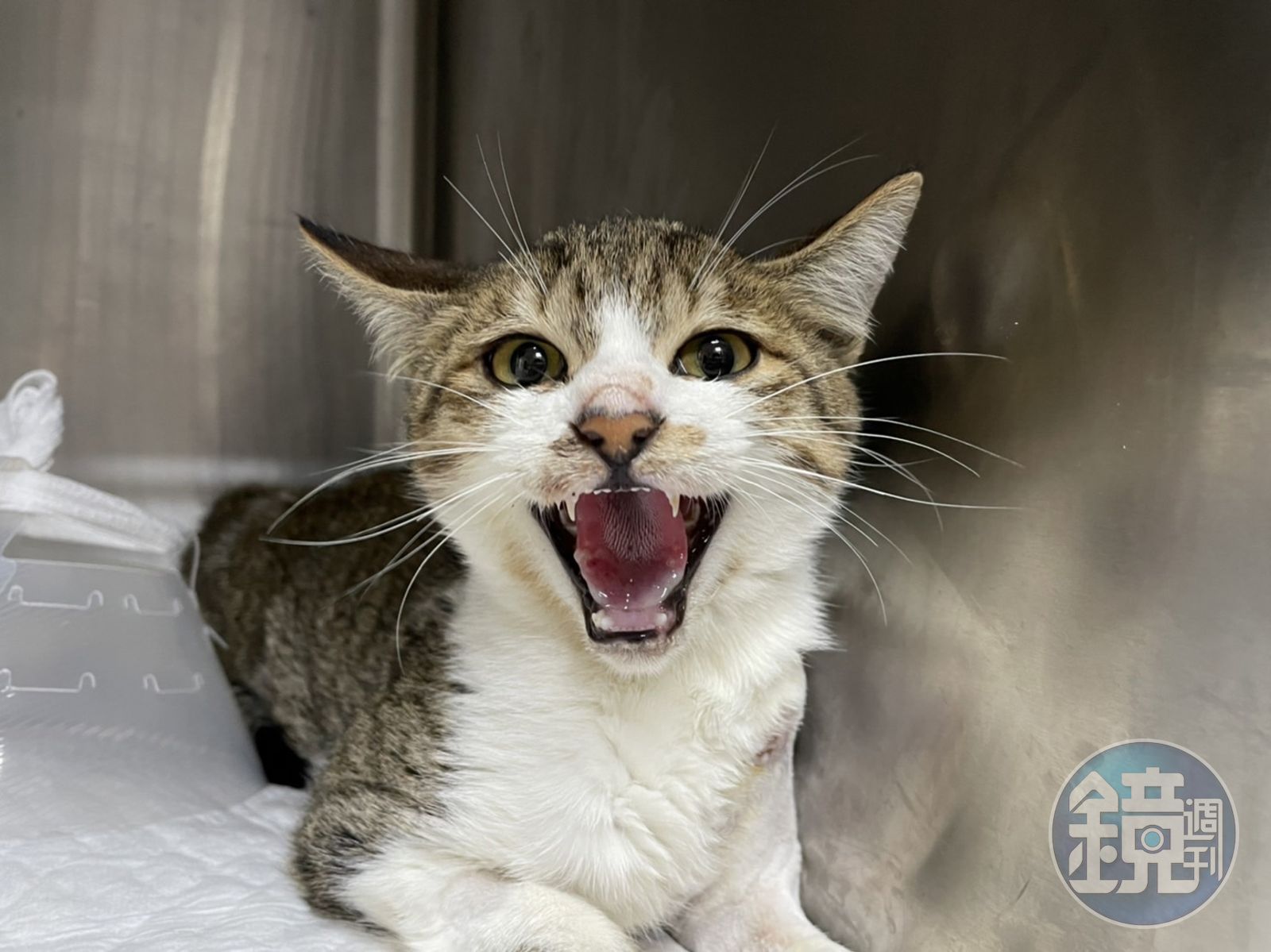 新北市政府動保處在去年11月15日深夜接獲民眾通報蘆洲區安南路上有白色虎斑小貓趴在路上,嘴角流血下巴處有血跡,請求援助,動保處接獲通報後立即前往搭救,先將動物送往夜間救傷醫院安置,並於11月16日將小貓帶回毛寶貝醫療中心進行後續檢傷醫療,經胡獸醫師檢查後,發現小貓左前肢上臂骨橫斷面交錯性骨折,左後肢大腿骨錯雜性骨折,小虎斑貓經過毛寶貝醫療中心獸醫師聯合進行2次外科手術後,目前已恢復健康,於五股動物之家等待認養。