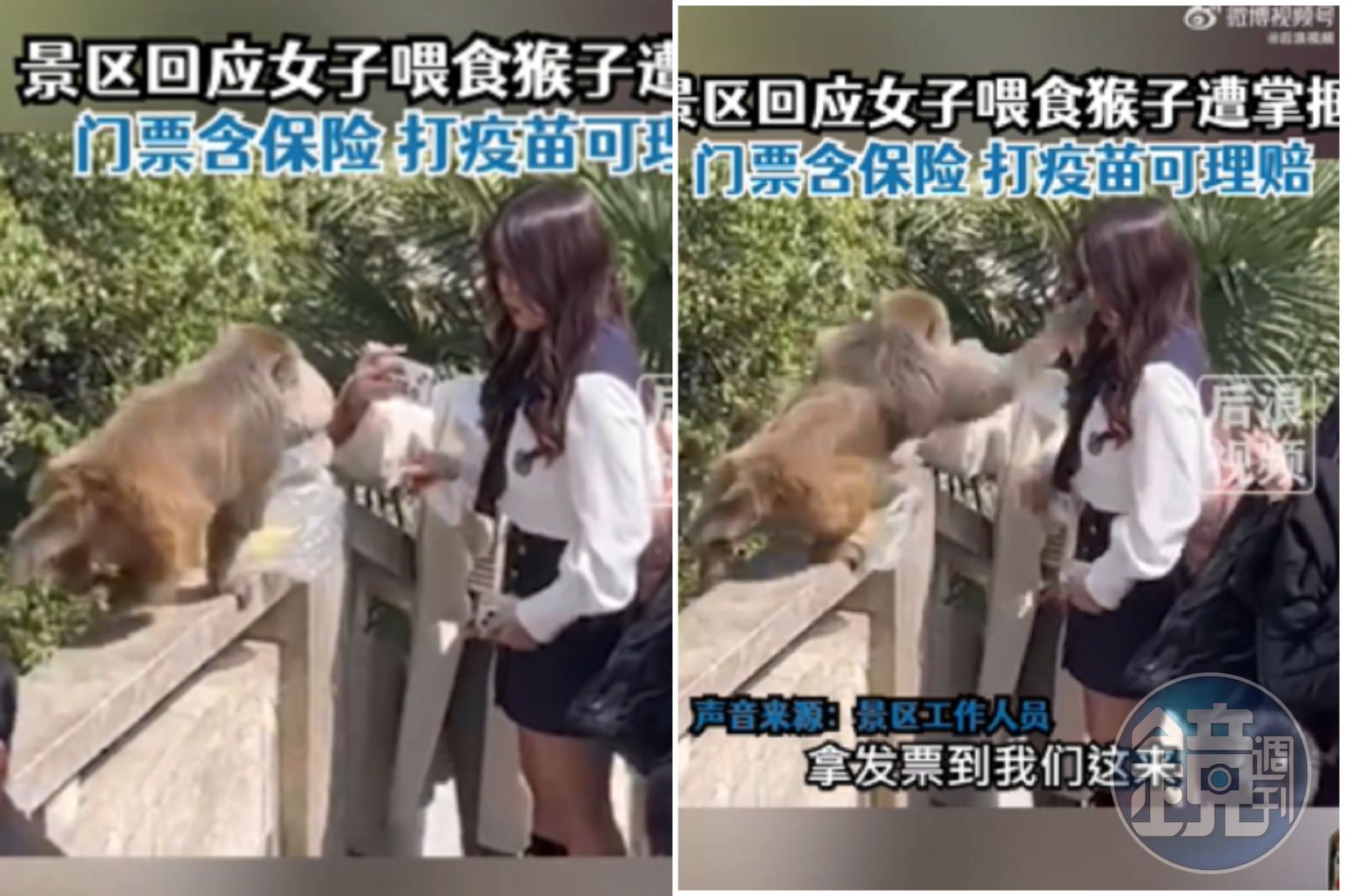 中國一名網友在本月26日發布這段影片,並指出她的朋友在園區內拿出鳳梨,要給猴子餵食。但猴子不但不領情,對於正妹的「隨意餵食」,更是當場進行教育,直接賞給妹子一巴掌,拍片的朋友嚇了一大跳。事後園區工作人員表示,如果這名正妹遊客有受傷,可以向園方聯繫,並稱門票有包含保險,如正妹需要打狂犬病疫苗,可向保險公司理賠。