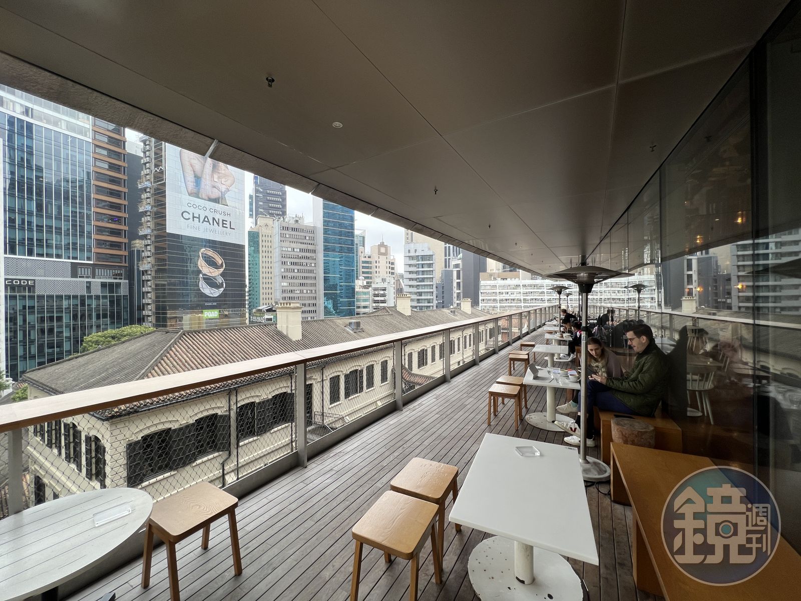 咖啡館內的空間挑高,以一整片落地玻璃窗分隔室內外,戶外座位正對著沐浴樓的屋頂,無論晴雨,都有人坐在戶外,悠悠欣賞中環摩天大樓與古老屋宇互相映襯的美景。