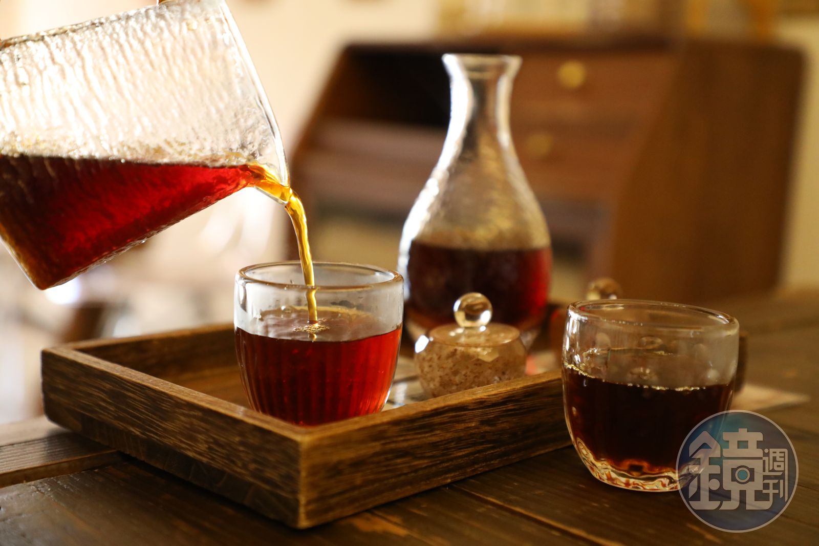 點完咖啡後,店主讓我們上到2樓等待,10多分鐘後,他端著兩個托盤上來,兩個錘紋玻璃壺中盛裝著淺褐色液體,靠近一點,便可聞到淡淡咖啡香。店主說,厄瓜多的Velez姊妹專門出品有趣的咖啡,成功改良了有氧水洗、日曬和蜜處理,又研發了厭氧水洗和需時46天的二氧化碳浸漬處理等新方法。Typica Mejarado是種原產於厄瓜多的特殊豆,蜜處理後酸味濃郁,後味則是芒果與紅加侖的香氣,十分特別。巴拿馬的藝伎則有花香也帶點果香,酸香甘美中透著清爽。我們就這樣在這個透著古樸味道的咖啡空間中,邊喝邊聊,十分愜意。