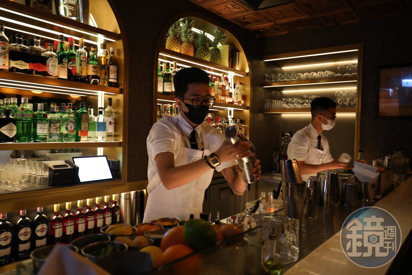 The DIPLOMAT的風格與PENICILLIN完全相反,若說PENICILLIN是冰冷前衛,那The DIPLOMAT就是溫暖古典,極其昏暗的燈光、黃銅飾面、典雅天花板、皮製座椅,座位不多,只有18席,酒客隱身黑暗中,所有視覺焦點都凝聚在打上燈光的吧台,調酒師們宛如登上舞台表演,一舉一動都養眼悅目、牽動人心。