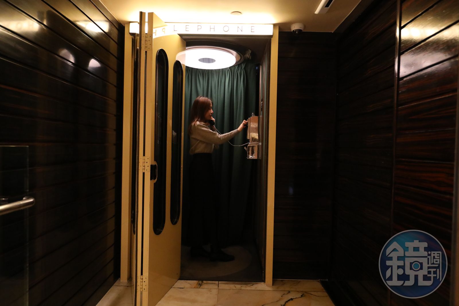 舉目四望,看不出MO Bar有沒有密室,只有一道樓梯通往半空中的閣樓,走上去看到一格拉門與布簾隔開的電話亭。這年頭哪來的電話亭?肯定有鬼,拿起電話看看可以打給誰,隨意按了幾個鍵,旁邊的暗門就應聲而開。