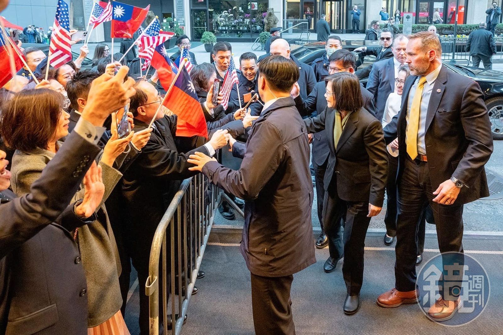 蔡英文過境紐約下榻飯店時,外頭有許多支持者舉著中華民國及美國國旗。(翻攝自蔡英文臉書)發布時間:2023.03.31 12:37 臺北時間