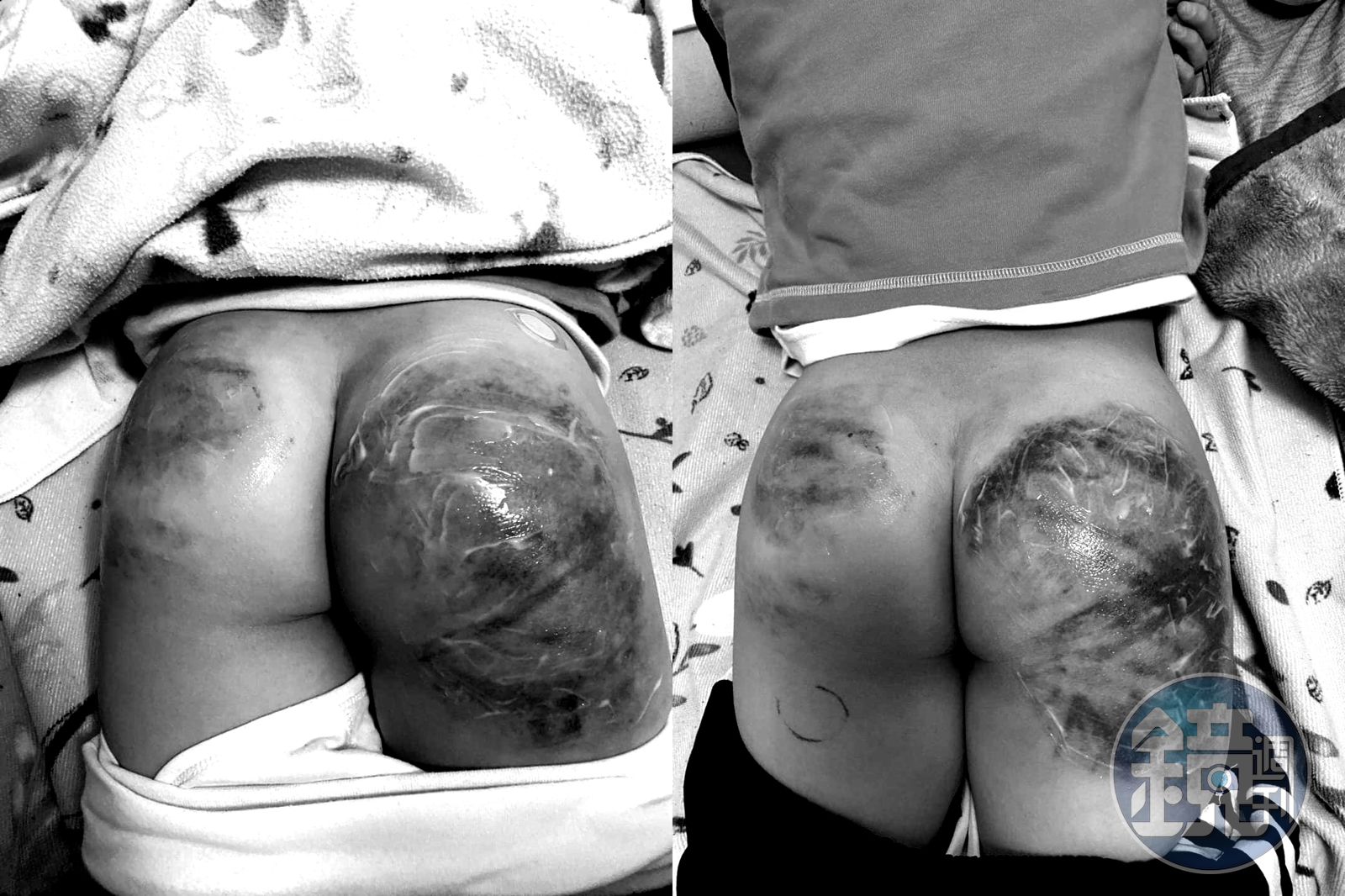 她心痛貼出照片表示,兒子屁股上的大片瘀青,都是該名教練用了至少2種不同粗細棍子毆打屁股至少15下,其中有一支很粗的擀麵棍,直徑大概4公分粗,造成她兒子「雙臀嚴重挫傷、瘀青」,導致3月9日無法走路,必需去醫院掛急診,事發後長達15天瘀青尚未消退。