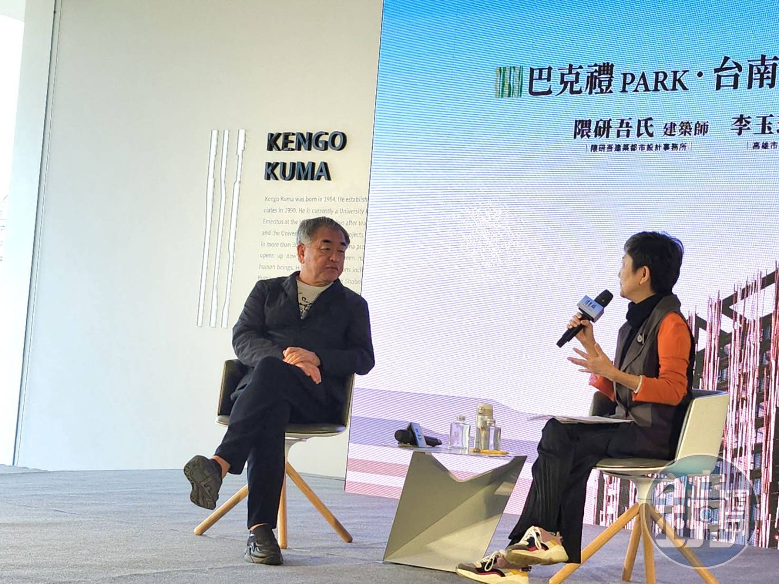4月2日,建築大師隈研吾親自來台,與高雄市立美術館館長李玉玲在巴克禮PARK接待中心進行一場建築設計對談。