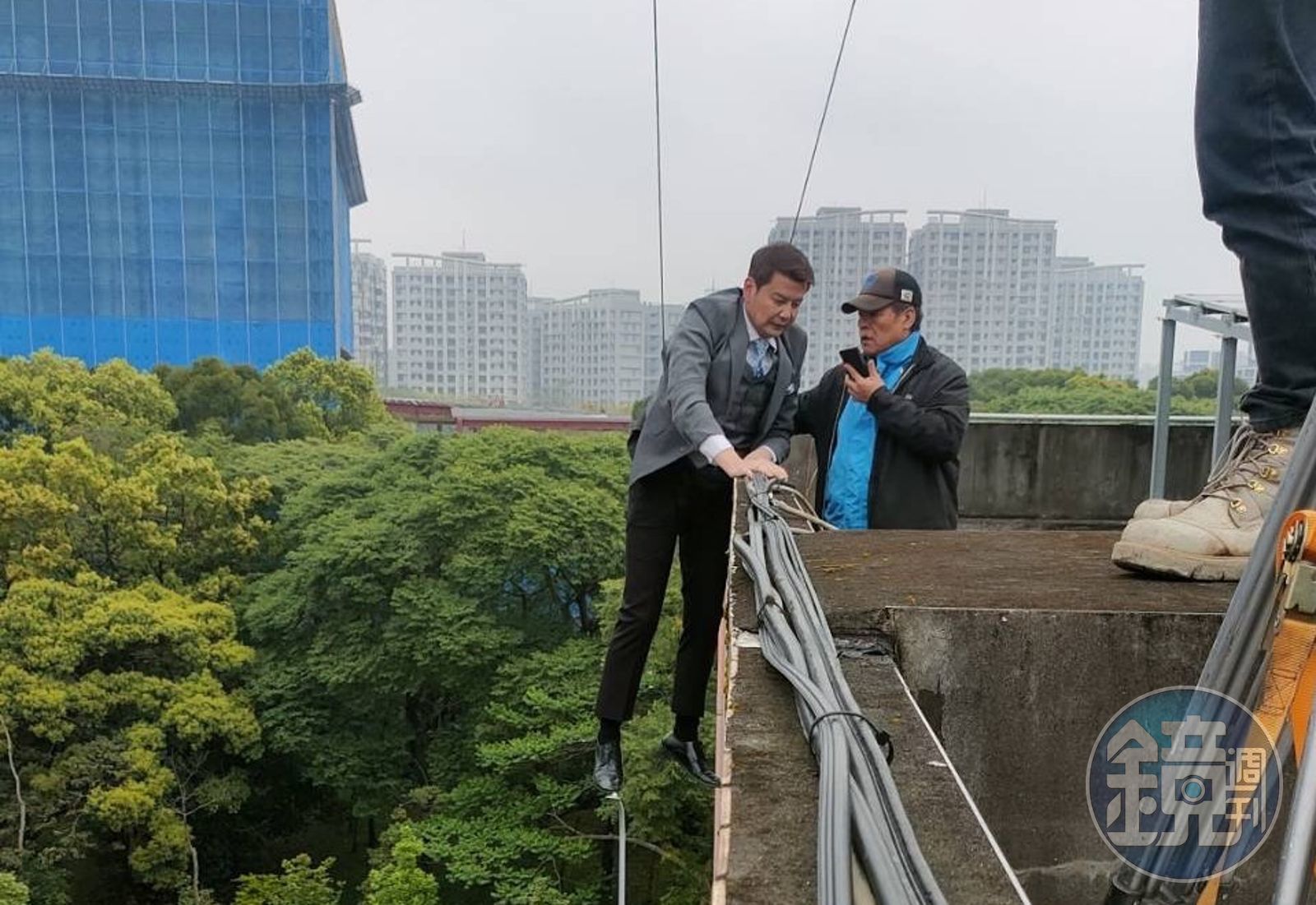 《市井豪門》倪齊民毛毛雨中吊鋼絲掛高樓圍牆外,場面驚險!(民視提供)發布時間:2023.04.03 12:43 臺北時間