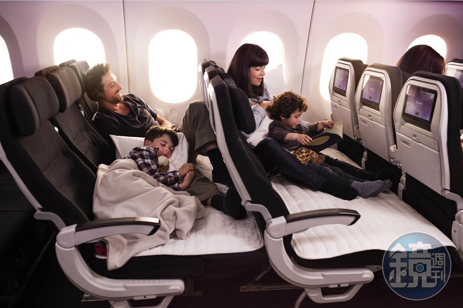 經濟艙空中沙發「Economy Skycouch™」為紐西蘭航空首創且深受歡迎的明星商品,特色為同排相鄰的三個座椅能輕鬆轉換成平坦沙發,打造「經濟艙也能躺著飛」的獨家體驗,特別適合一同出遊的伴侶、親子族群。該座位與經濟艙座位相同,但設有額外腳踏,可以升起一半用作腳凳,或是完全升起創造一個獨立的大沙發空間。Skycouch的優勢在於,它是在經濟艙就可以擁有的小確幸,因為無需全價購買3個座位,卻能享用3個位置組成的沙發空間。尤其當一家多口人出遊,它可以變成小朋友在3萬英呎高空中的遊樂場,搭配專屬床墊及棉被,打造舒適的睡眠體驗。
