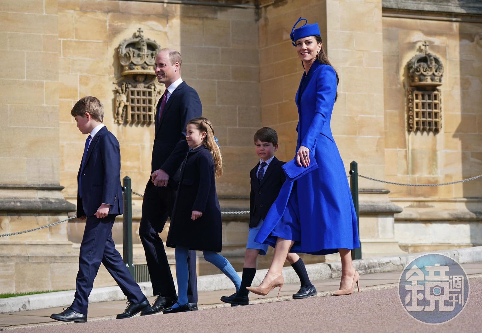 凱特王妃週日再度「舊衣回穿」,身穿去年就穿過的寶藍色Catherine Walker大衣洋裝,搭配同色系Emmy London手拿包、Lock & Co. Hatters藥盒帽,以及Gianvito Rossi裸色高跟鞋,Shiels Jewellers耳環,優雅大方。她牽著小兒子路易走入教堂,古靈精怪的路易再獻「超萌表情包」,面對鏡頭露出困惑、偷笑的眼神都十分可愛。