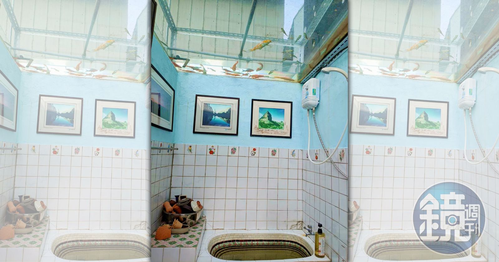 一名網友在臉書社團「路上觀察學院」發文,「入住新社一家懷舊民宿,發現天花板是魚缸,好刺激」。照片中可以看到,該間浴室下半部是傳統的花磚風格,上半部則漆上水藍色的油漆並掛了幾張畫,再往上看,頭頂的天花板竟是魚缸,透過透明玻璃可以看到魚兒在頭上游啊游,甚至能看到外頭的建築物及藍藍的天空。