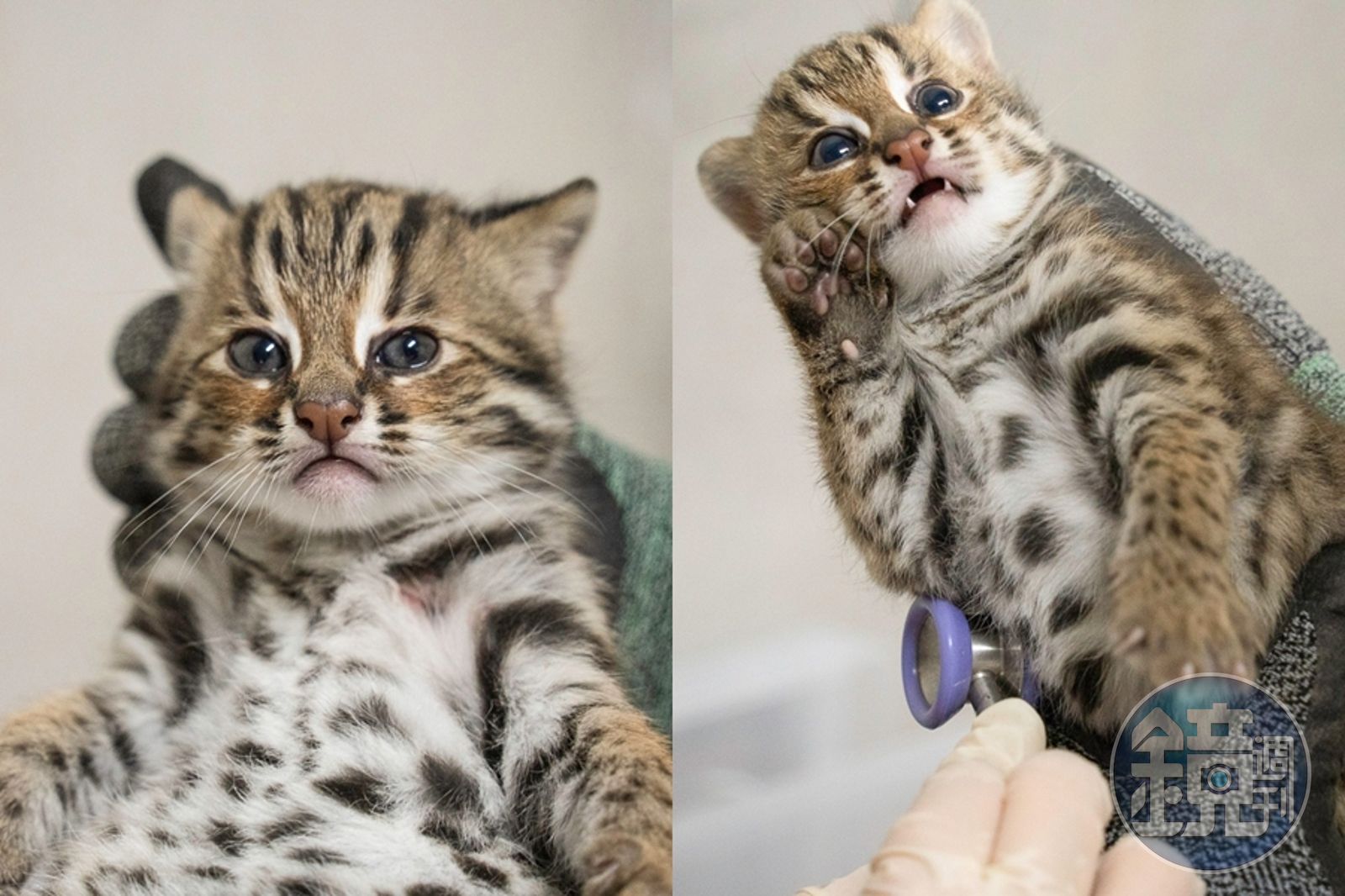 隨著寶寶活動力發展趨於成熟,照養團隊與獸醫師們也在本月11日上午趁著石虎媽媽外出替兩隻寶寶進行健檢,除了測量體重、胸圍、身長外,亦藉由目測外生殖器官的樣貌判斷,兩隻寶寶是一公一母,公的寶寶體型略大,體重為702公克,母的則是628公克。