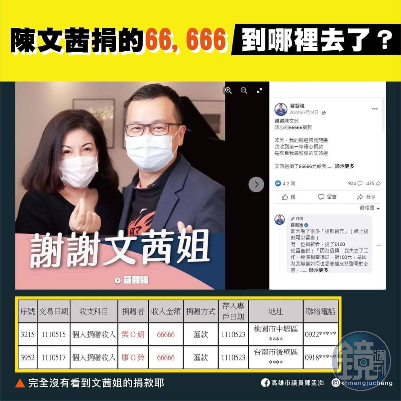 鄭孟洳表示,去年羅智強宣布參選桃園市長後,政治獻金自5月12日開帳,13日他便在臉書上發布「募集糧草」的貼文,而後於14日貼文表示自己收到第一筆捐款來自「最敬佩的文茜姊」,數字是6萬,6666元,短短的兩周內,便募集了1,400萬的政治獻金。但是羅智強這筆從陳文茜手上所收到這筆錢,卻無法在政治獻金申報資料裡查詢到,陳文茜的這筆政治獻金到底去哪裡了?是否違反政治獻金法?希望羅智強能夠出來說明。