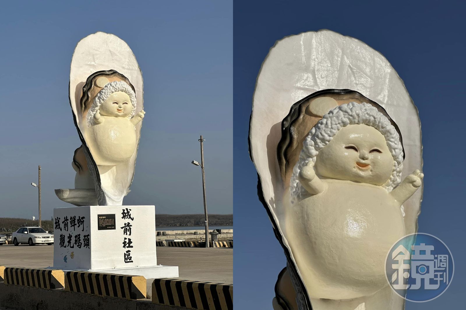 有網友在臉書社團「沿著菊島旅行-澎湖資訊網」發文,「講美城前ㄜㄚ(蚵仔)熊蓋讚!」,而這正是位於位於澎湖縣白沙鄉城前鮮蚵觀光碼頭的新地標。 後方還有一顆小的牡蠣精。(翻攝自沿著菊島旅行-澎湖資訊網)只見巨型牡蠣中有個白白圓圓,臉上掛著燦笑的牡蠣精,一隻手比讚、另一手比YA,而後方還有個小小的牡蠣精,雙手高舉,臉上神情看起來相當有精神。就有網友看到後,笑稱這撞臉藝人白冰冰,「冰冰姐!」