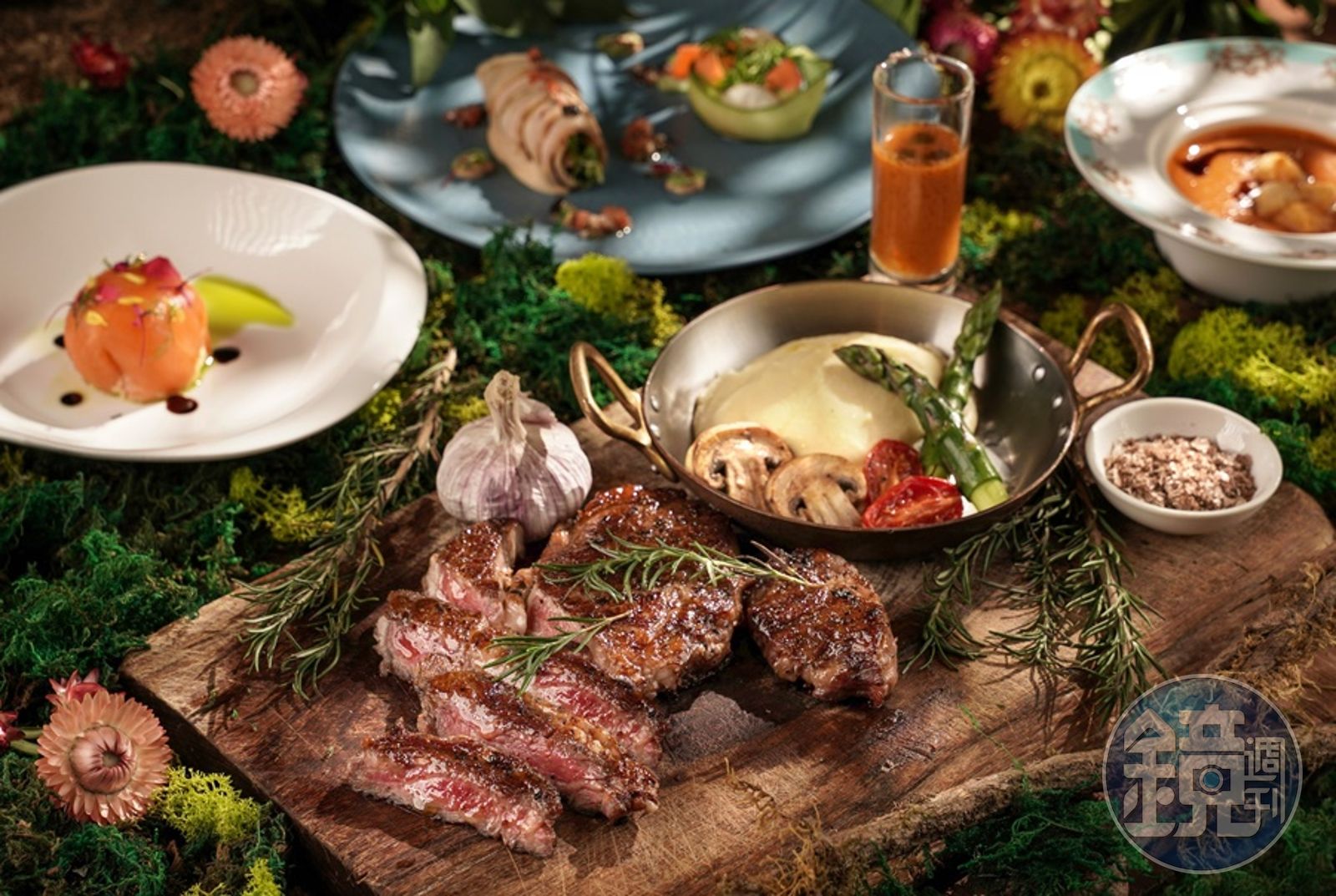 主菜首推「彰化玫瑰鴨/鴨腿薯泥/巨峰葡萄醬汁」,有別於一般櫻桃胭脂鴨,主廚嚴選彰化苑里所培育玫瑰鴨,由於屠宰過程中保留較多血水,煎烤至五分熟,能維持肉質特殊風味與軟嫩口感,在季節時蔬的陪襯下,搭配鮮採巨峰葡萄與肉汁熬煮成葡萄醬汁,與配菜「鴨腿絲馬鈴薯泥」一起入口,酥脆的鴨皮與鮮嫩鴨肉,被葡萄果香及馬鈴薯起司的濃郁氣息所染,激活味蕾,讓饕客品嚐到春鴨的絕美滋味。