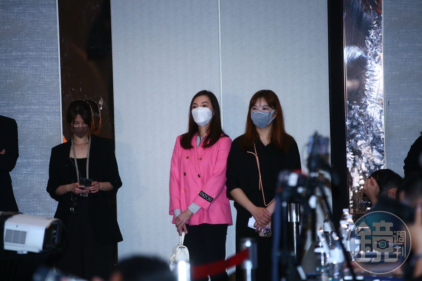 曾馨瑩今陪同郭台銘出席記者會,全程配戴口罩,站在台下低調力挺。她身上的Patou粉紅色雙排扣外套十分吸睛,這件外套在Farfetch網站售價2萬1,774元。她還搭配黑色長褲,手拎Valentino Garavani One Stud白色手袋,優雅大方。