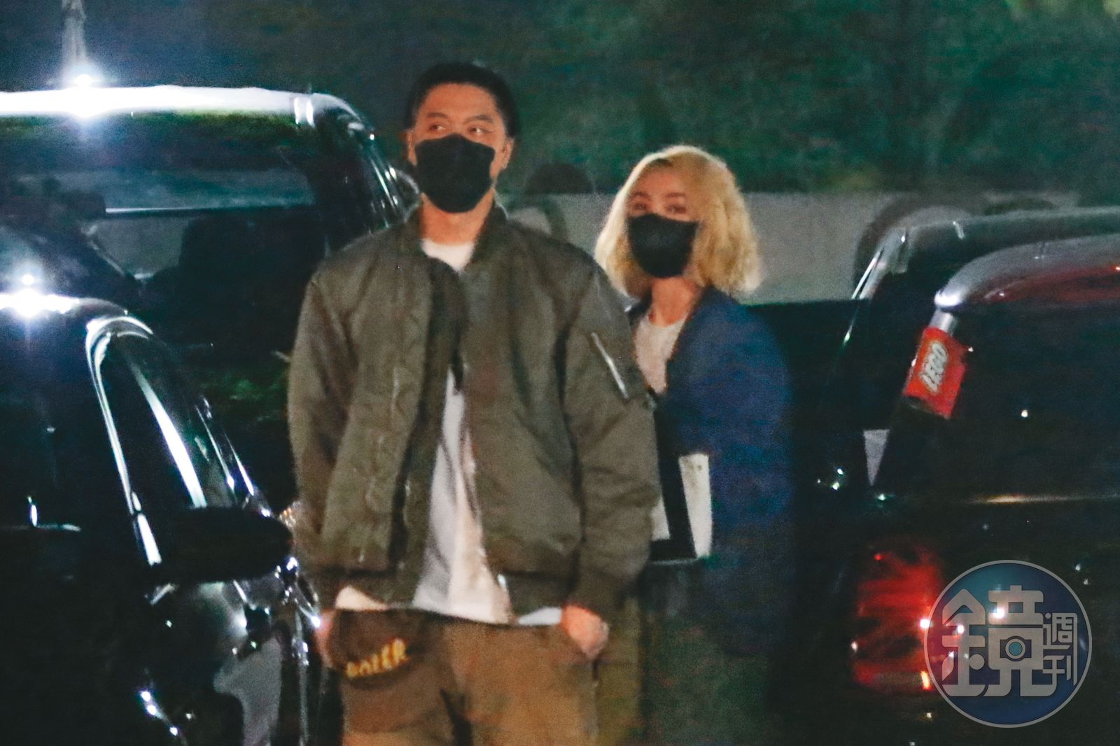 當天晚上7點出頭,一行人似乎看完展覽了,走到外面聊天,周湯豪拿著手機一直在拍展間門口。接著一男一女友人先行離開,剩下周湯豪、鄭雲燦與葉韋廷繼續聊,然後散會。重點來了,此時周湯豪與鄭雲燦一同走到停車場取車,頓時畫面的曖昧度迅速竄到最高。