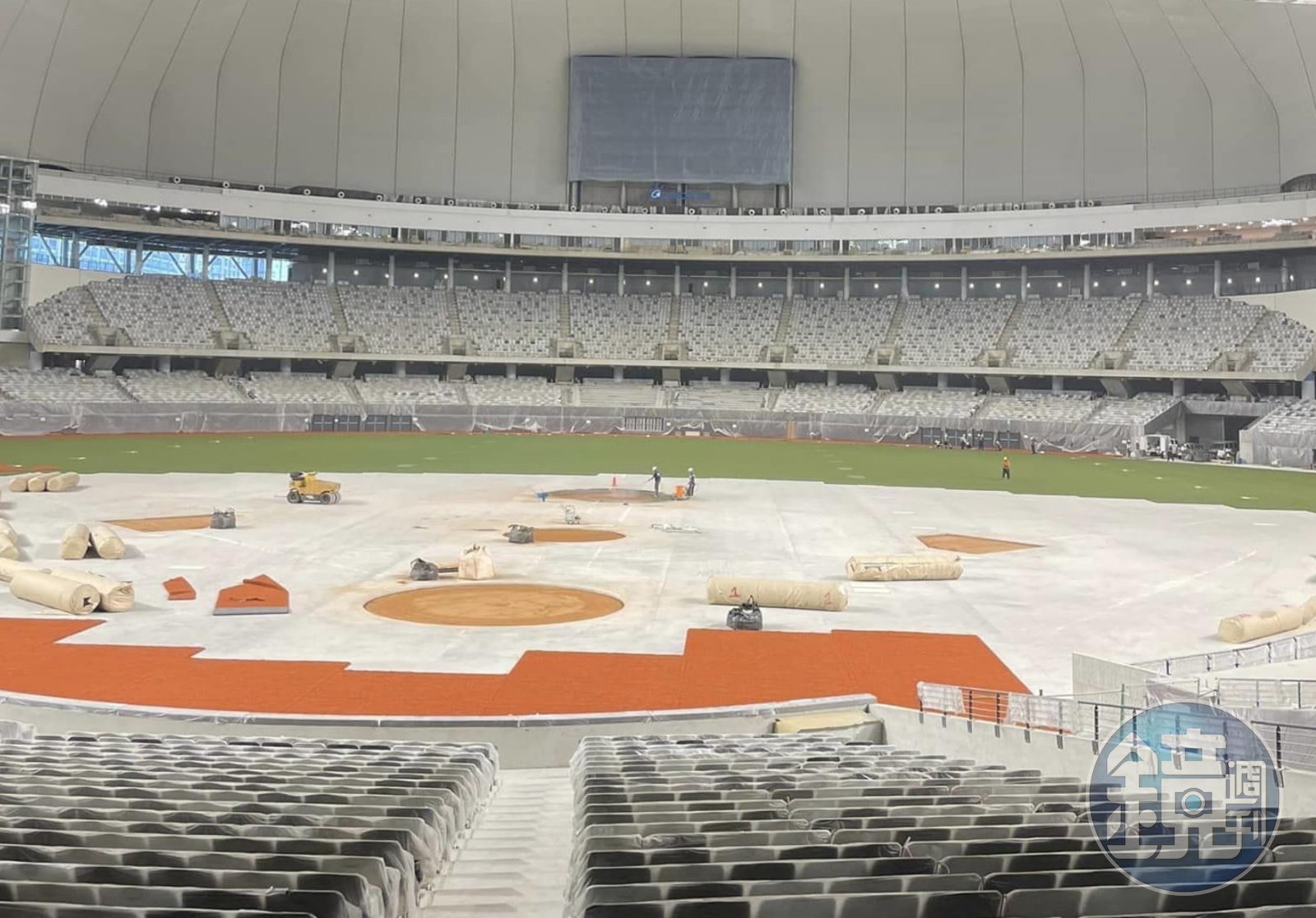 根據《三立新聞網》報導,有網友昨晚在臉書社團內貼出大巨蛋內部整建球場的照片,自本壘板後方觀眾席所拍攝,能看見外野人工草皮幾乎鋪上,內野則佈滿紅土,剩下壘包與草皮沒鋪上;螢幕除了外野正中央有設置,兩側各有一個小螢幕。