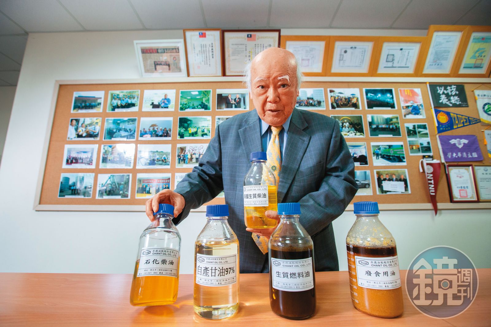 「這些(廢棄油)都是生質柴油的原料。」談到生質柴油的製作原理,逾85歲的承德油脂創辦人李義發思路清晰地向本刊說明,生質柴油主要從油菜籽油、黃豆、棕梠等植物油萃取出脂肪酸後再摻以甲醇,經過鹼酸催化反應生成「脂肪酸甲酯(Fatty Acid Methyl Ester:FAME)。」也就是生質柴油原型,最後在真空高溫下蒸餾提煉,就能作出清澈無雜質的高品質油。